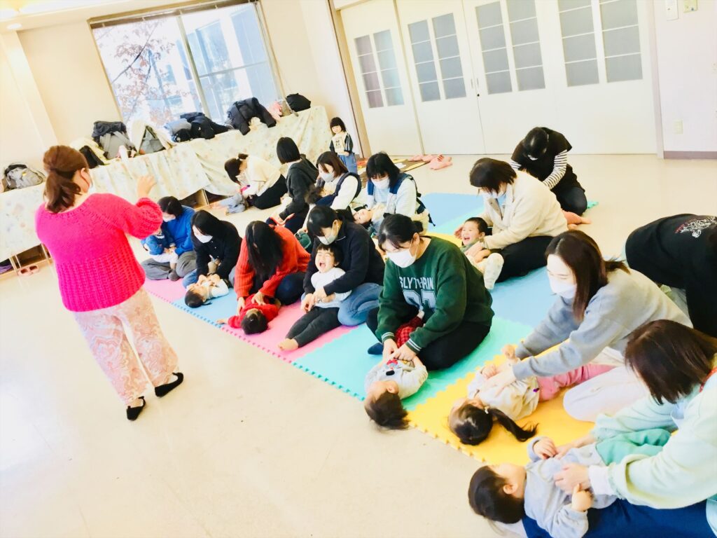 お母さんとわらべ歌でふれあい遊びをしますよ。わらべ歌「おふねはぎっちらこ」では、ぎっちらこと体を前後に倒して楽しみました。