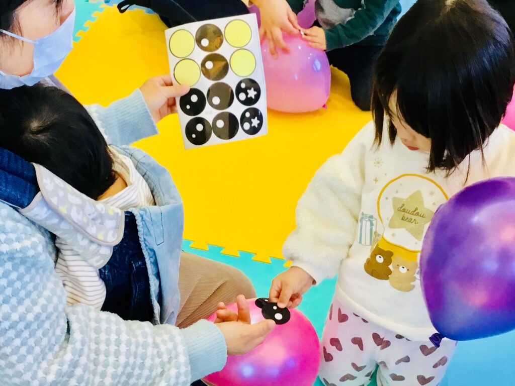 次は、カラフルな風船を配ってもらって・・・風船に大きな目のシールを貼っていますよ。