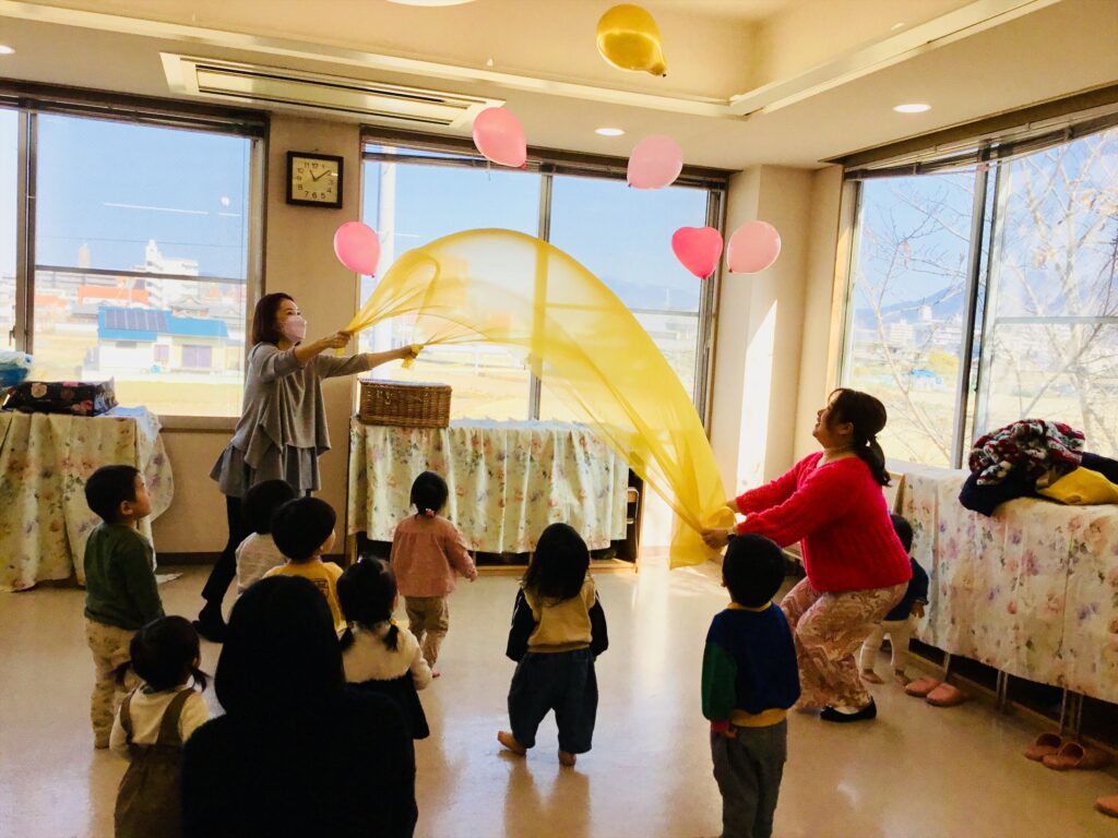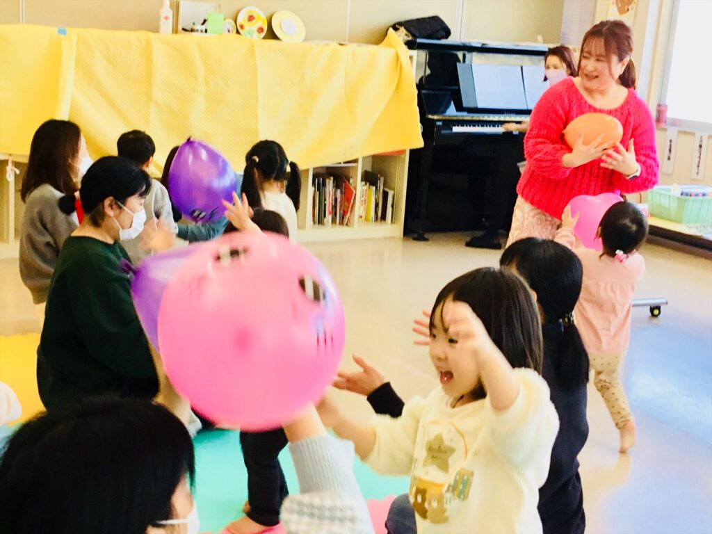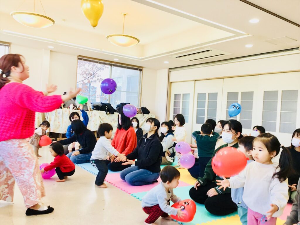 わらべ歌「まあるくなあれ」の歌に合わせて、オリジナルの風船を飛ばしたり、親子でキャッチしたりしました。