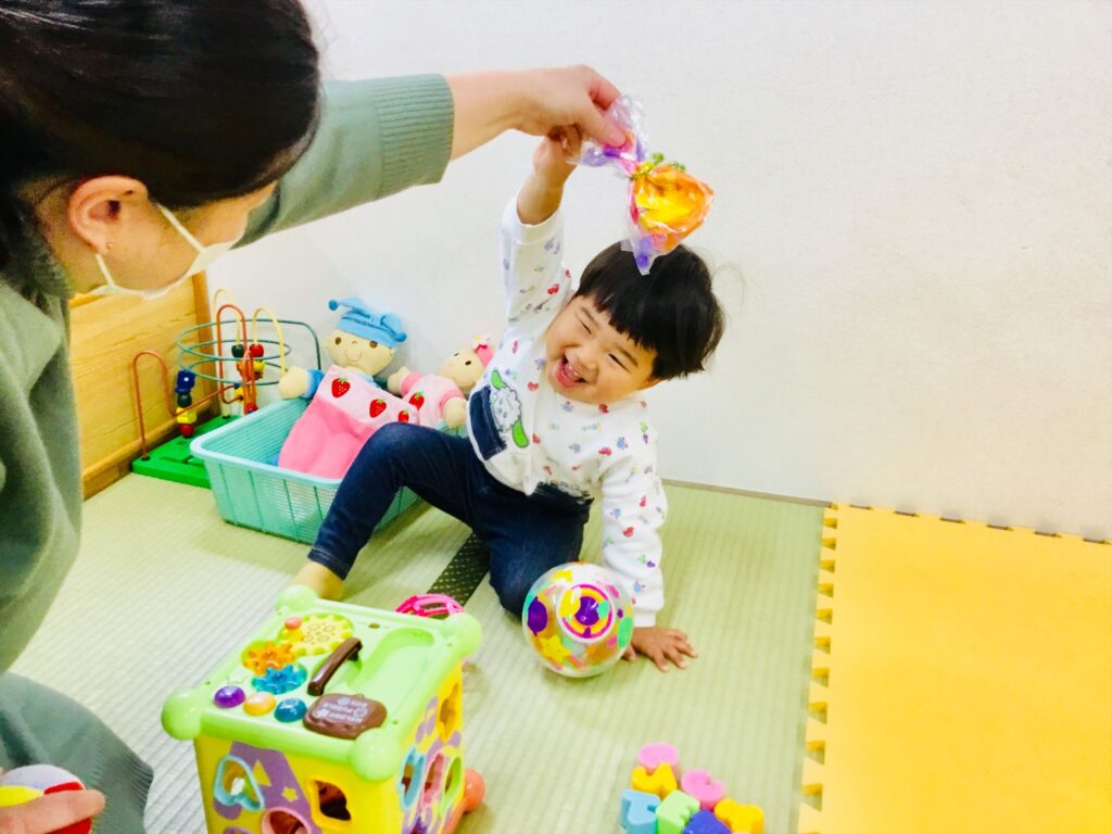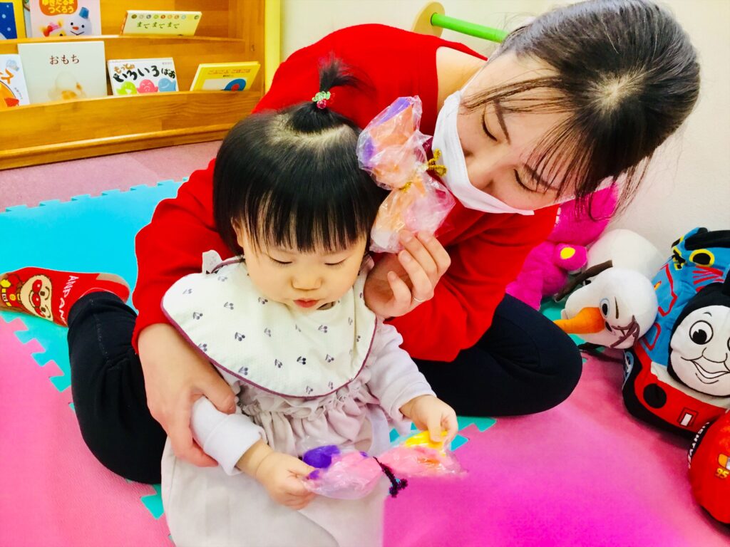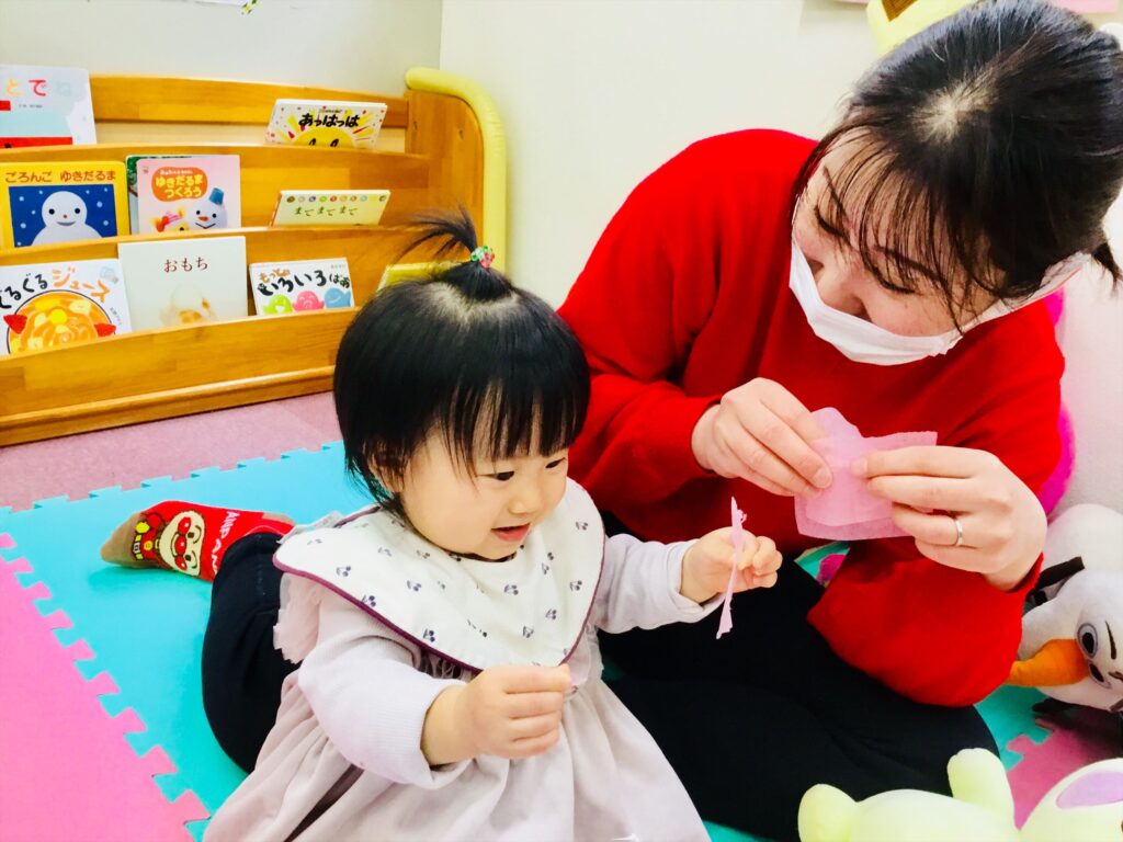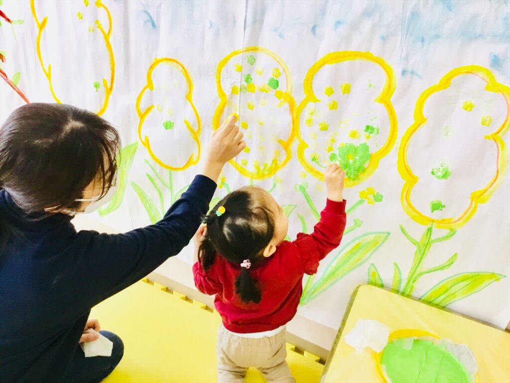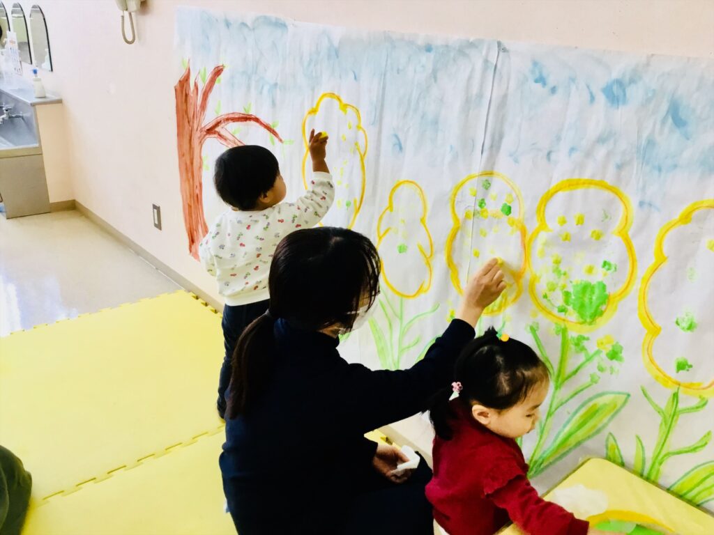 子育て支援ブログ Top 子育て支援 子育て支援ブログ 春みぃつけた♬ 今日から、支援センタールーム前の広場の壁面を菜の花に変更しています。 菜の花は、大根を花形にくり抜いた野菜スタンプを押して花のイメージを膨らませています。 クレパスで絵を描いたり、スタンプを押したり・・・春を感じながら制作を楽しんでいます♬ 色々な色の花紙をビリビリ~!!っと破っています。 袋に詰めると・・・カラフルなちょうちょになりました。 お母さんが、蝶を動かして「ひらひら~。」頭にとまって、にっこにこ~(^^♪少しずつ春を感じながら一緒に遊びましょう♬ 2026.02.20