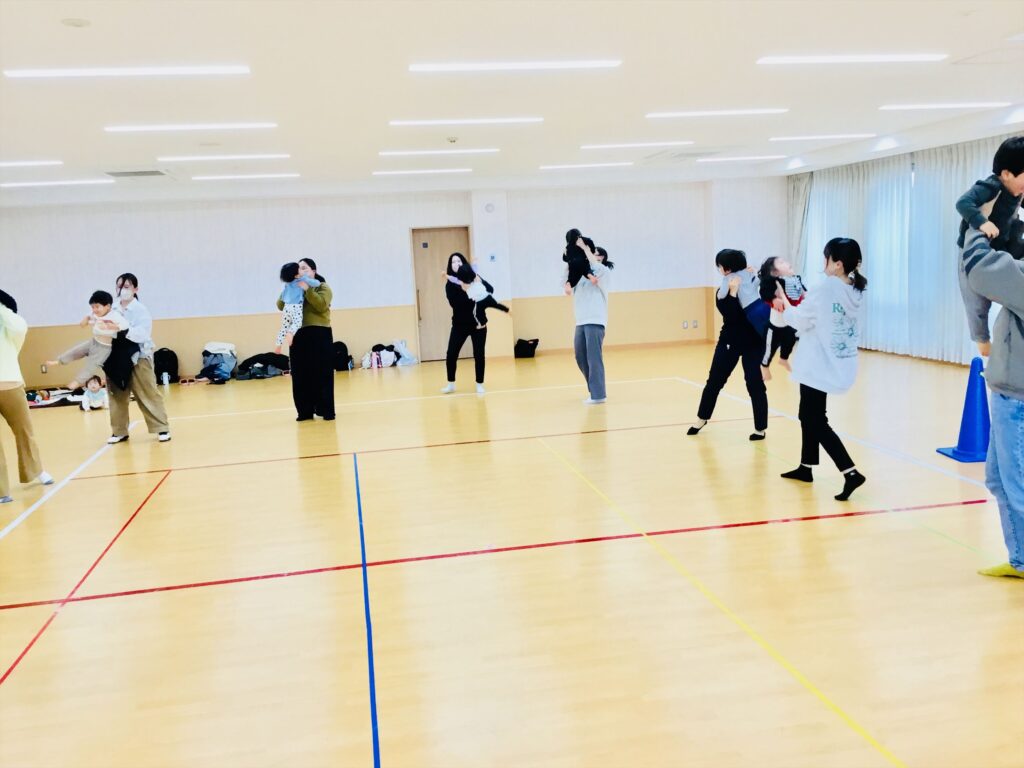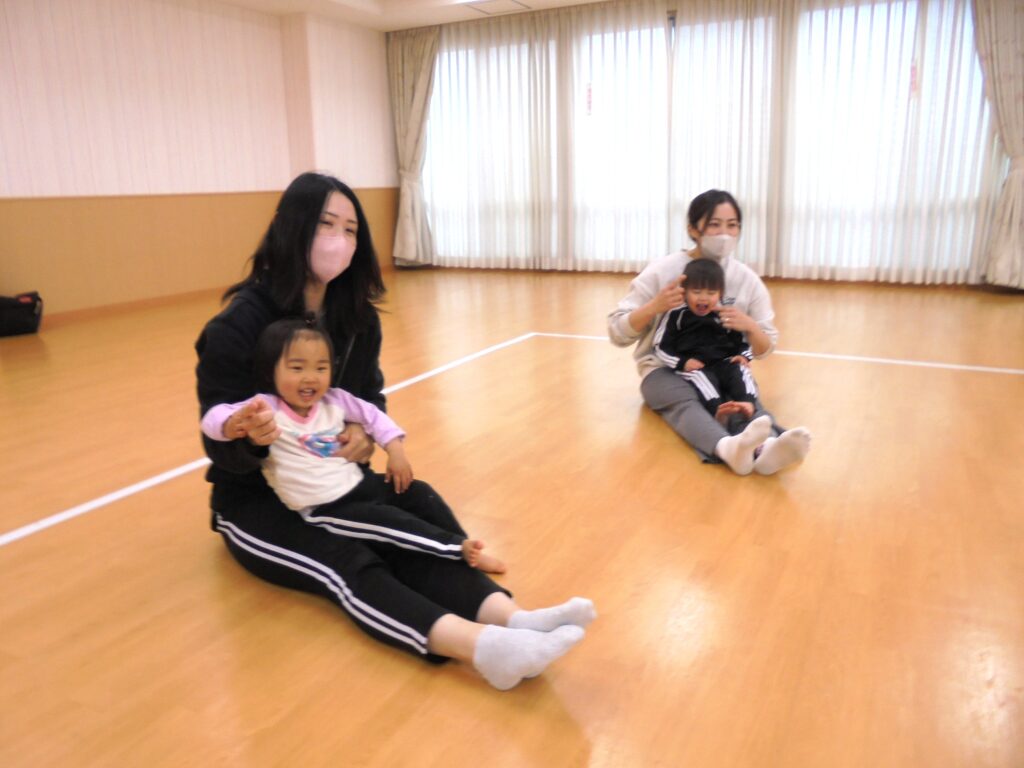 「大人公園」のリズム体操からスタートです。お母さんに抱き上げてもらって、ブランコゆ~ら。ゆ~ら。可愛い笑顔が広がりリラックス(^^♪