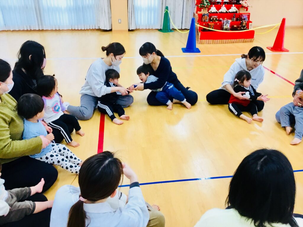 梅の花が咲きだし春の訪れを感じるようになりました。お手玉が登場して、わらべ歌「うぐいすの谷渡り」をしました。お隣りのお友達に、唄に合わせて、お手玉送りをしていると・・・