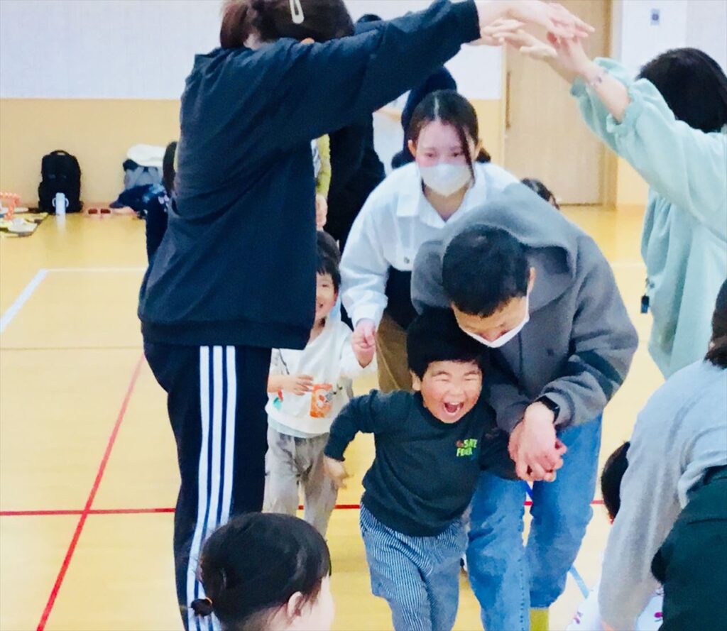 今度は、先生がトンネルを作っていますよ。「うぐいすの谷渡り♪」のわらべ歌に合わせて、トンネルくぐりです。
