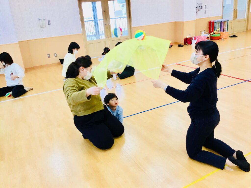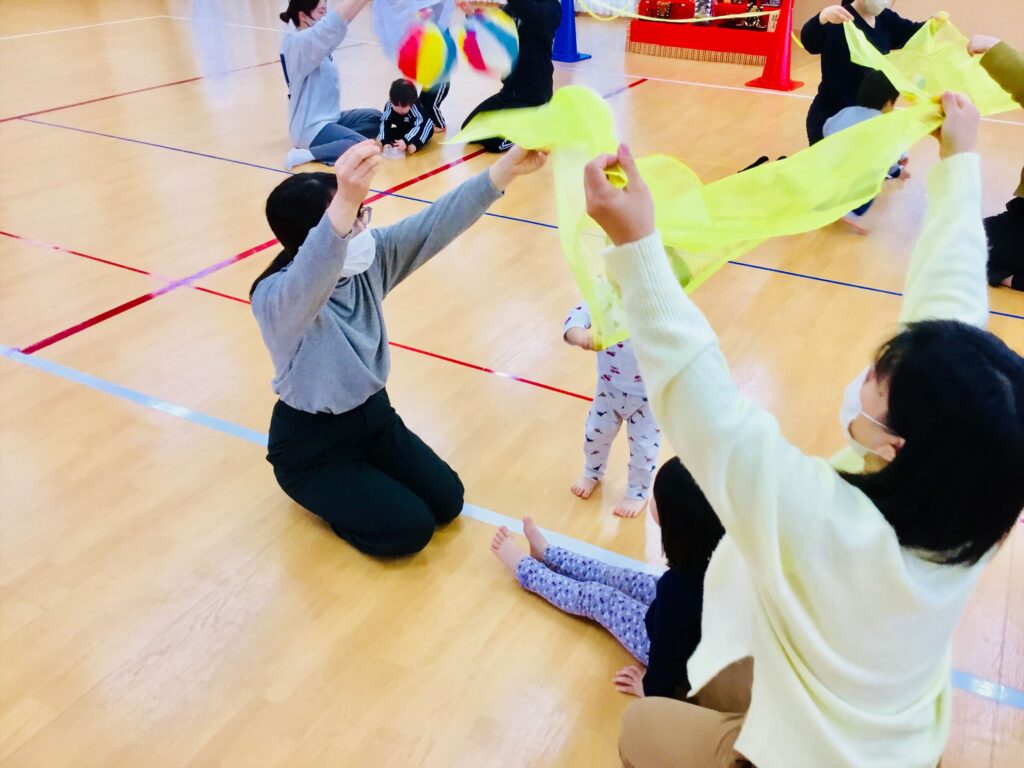 スカーフの上に紙風船を乗せてお母さん達に上下に動かしてもらいました。