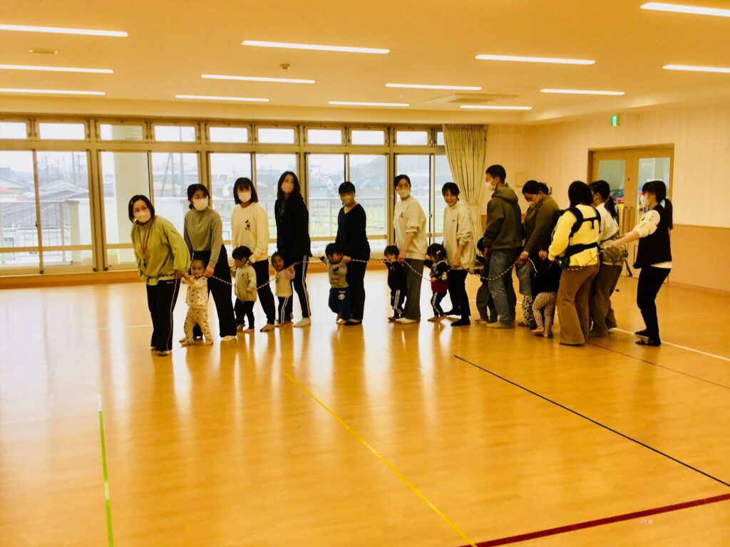 長いロープが出て来ましたよ。みんなで、ロープの中に入ると・・・仲良し電車号の完成!!出発進行!!