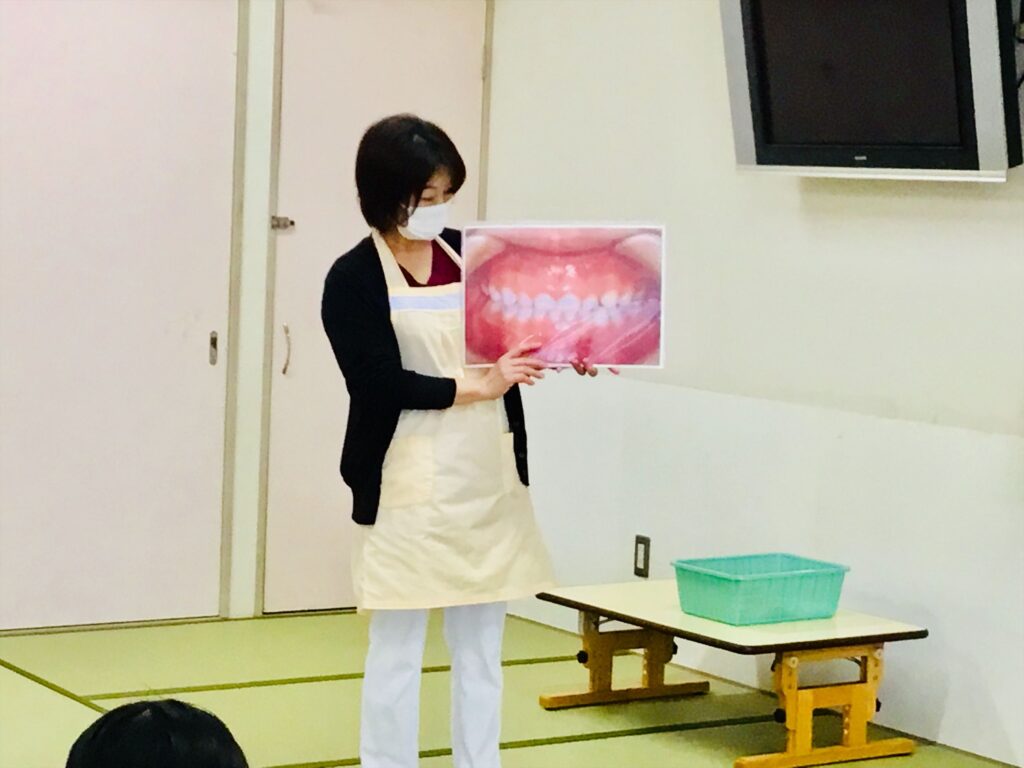 歯科衛生士より「お口の機能の成長について」の講話をして頂きました。噛むと言うのは、食事のみならず、言葉の発声を助けたり、顎の発達にも繋がります。