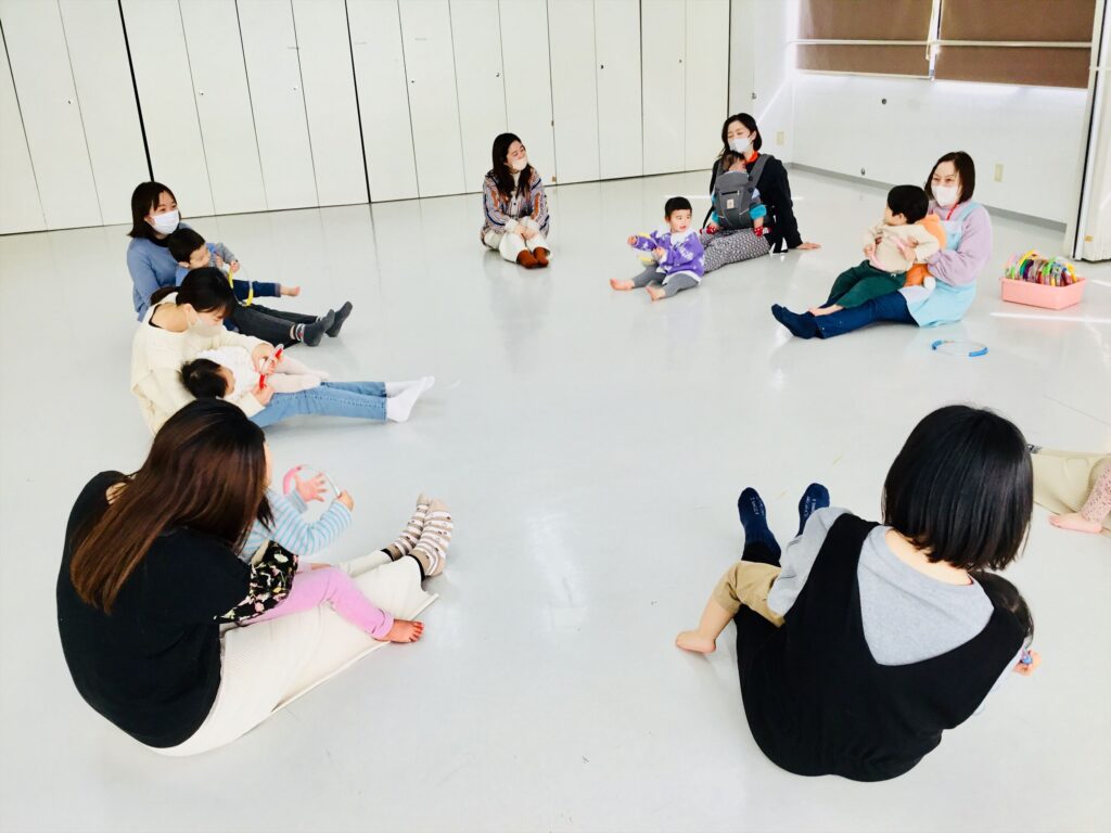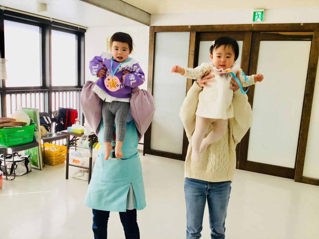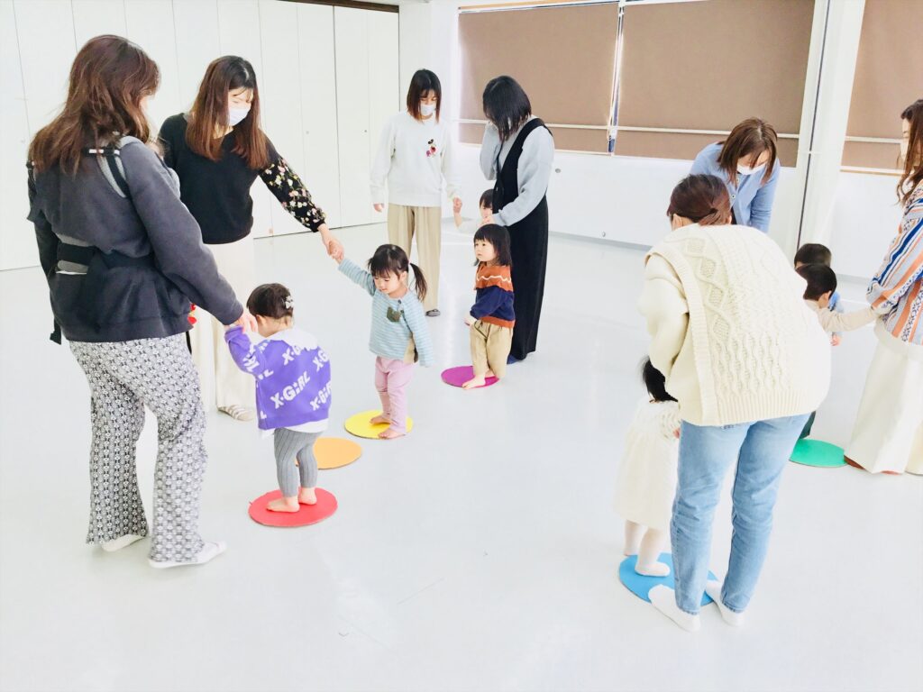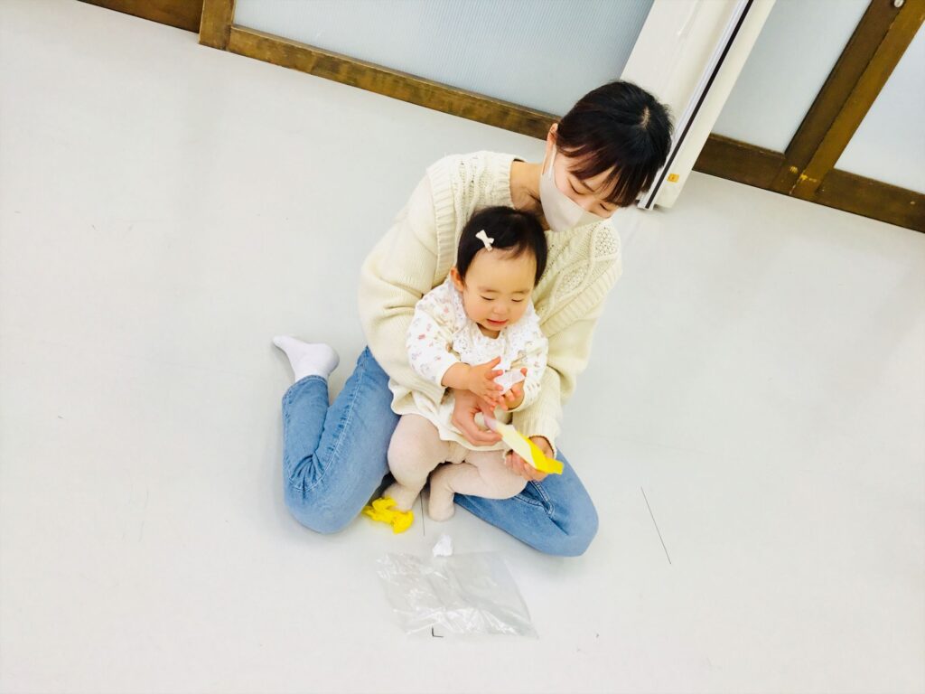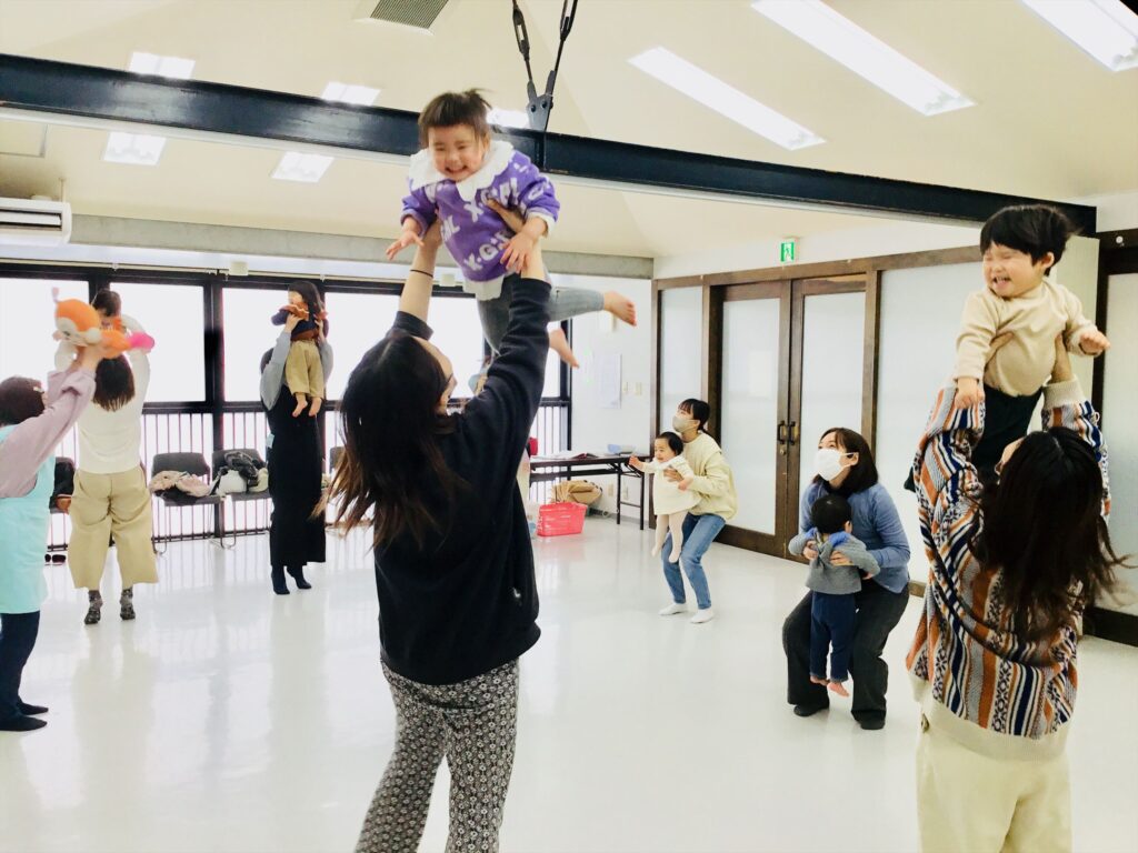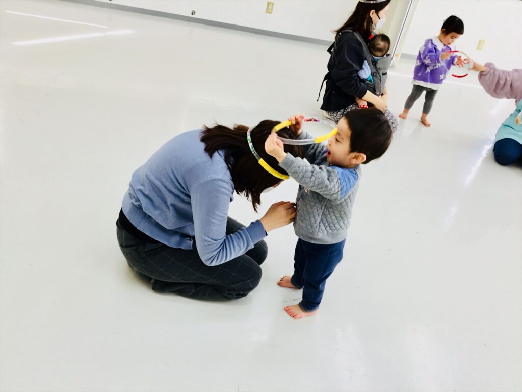 まず始めに、「大人公園」のリズム体操からウォーミングアップ!!お母さんに持ち上げてもらって可愛い笑顔が広がりました。