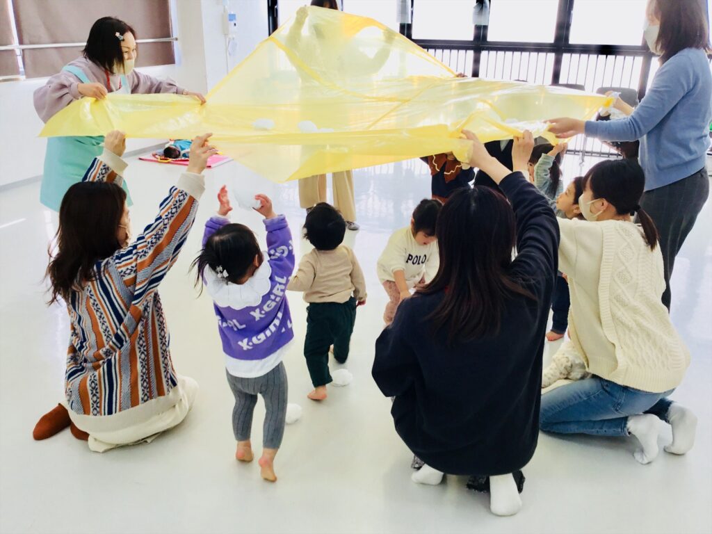 綿毛に見立てた、たんぽぽが舞いだすと、子ども達はシートの下に入って大喜び!!
