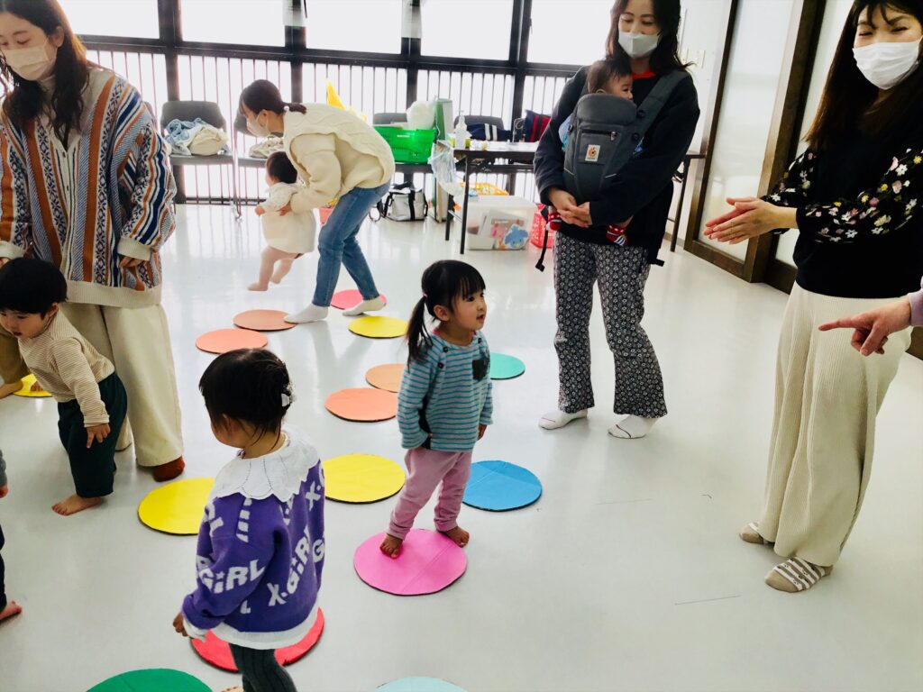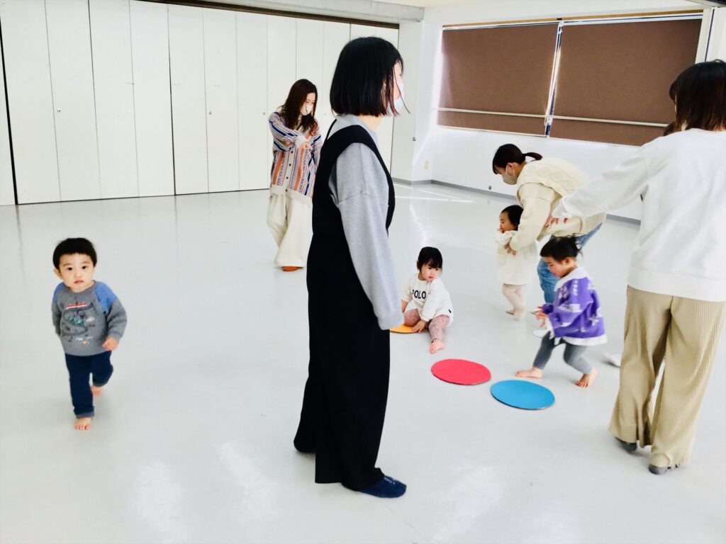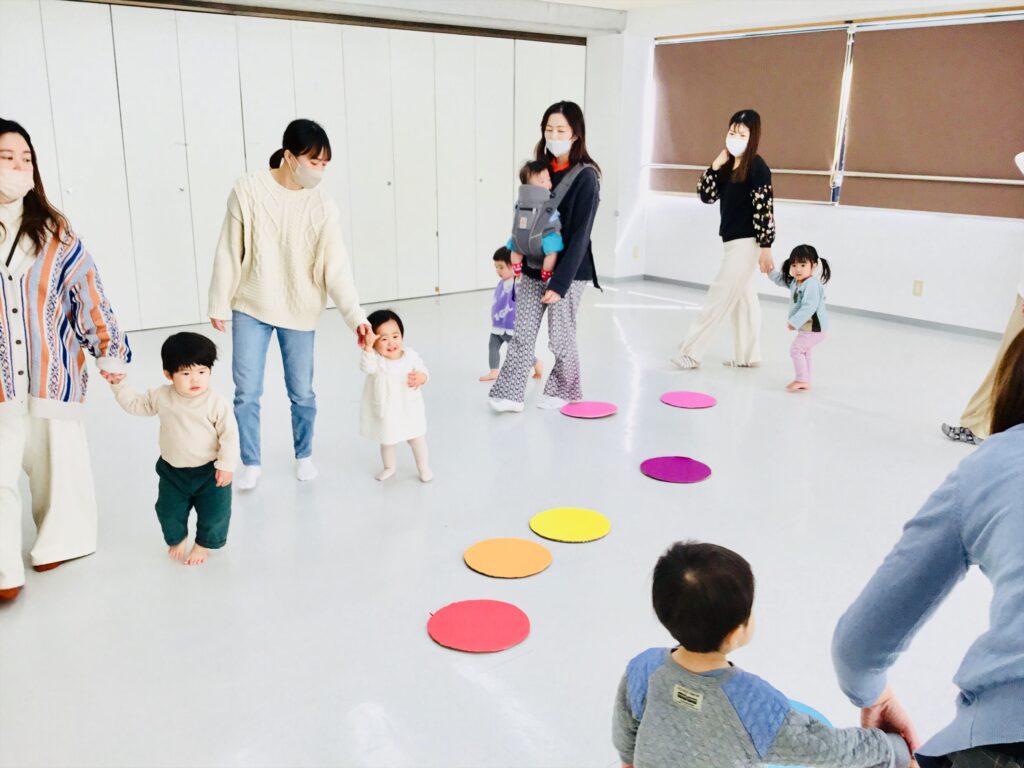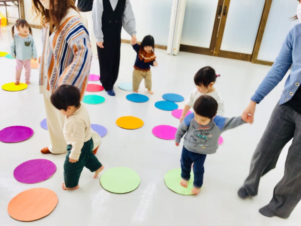 部屋いっぱいに、カラフルなボードが並びました。みんな、ワクワクしながら色の上を歩きます。
