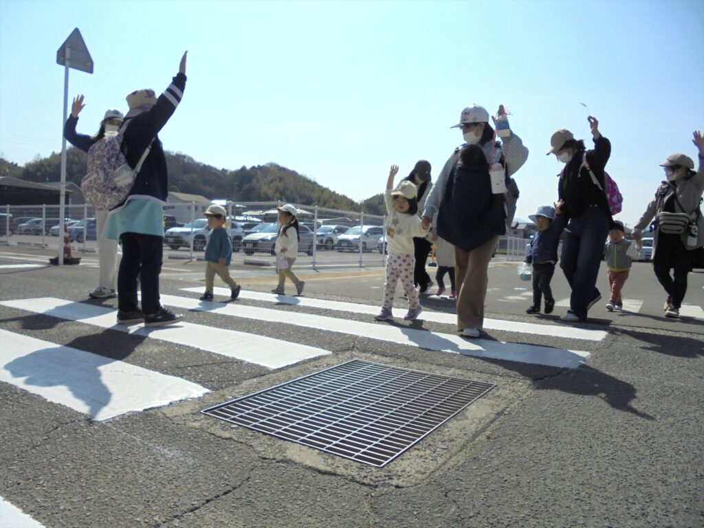 「横断歩道渡りまぁす!!」と、先生が言うと手を挙げて歩いた子ども達。