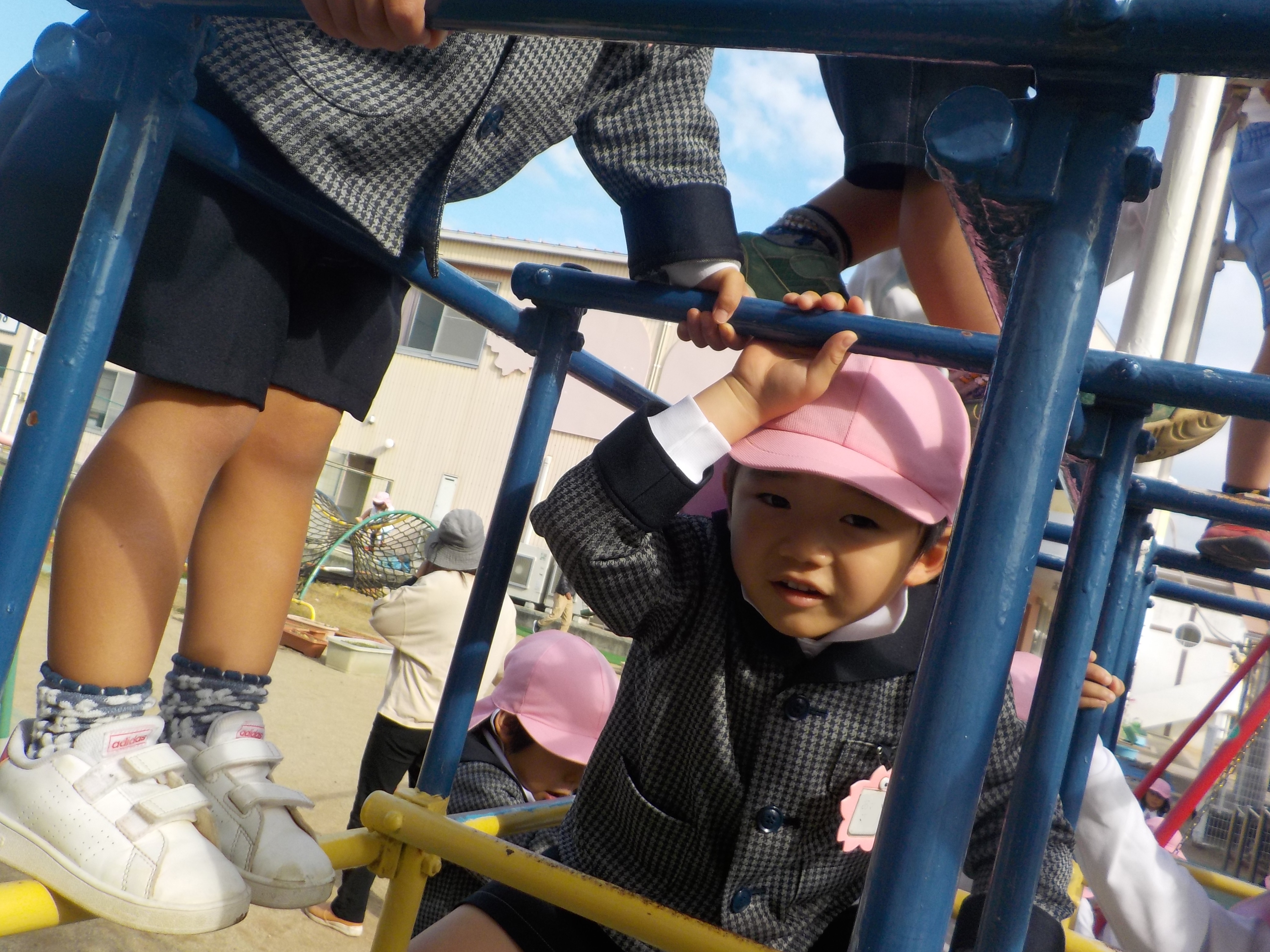給食をたくさん食べて、元気もりもりの子どもたち。みんなで相談して第2園庭に遊びに行くことにしました。遊具で遊ぶ時の約束を伝えると一目散に太鼓橋やジャングルジムなどへ駆けていきました。最初は、怖くて出来なかったところも、友達と一緒に挑戦すると、登りきる子どもがたくさん増えていました。中には「怖いな。」と言っている子もいましたが、「こうやって登ったらいいんだよ。」と教えてあげる姿も見られました。これからも友達同士のかかわりを通していろんなものに挑戦してほしいなと思います。