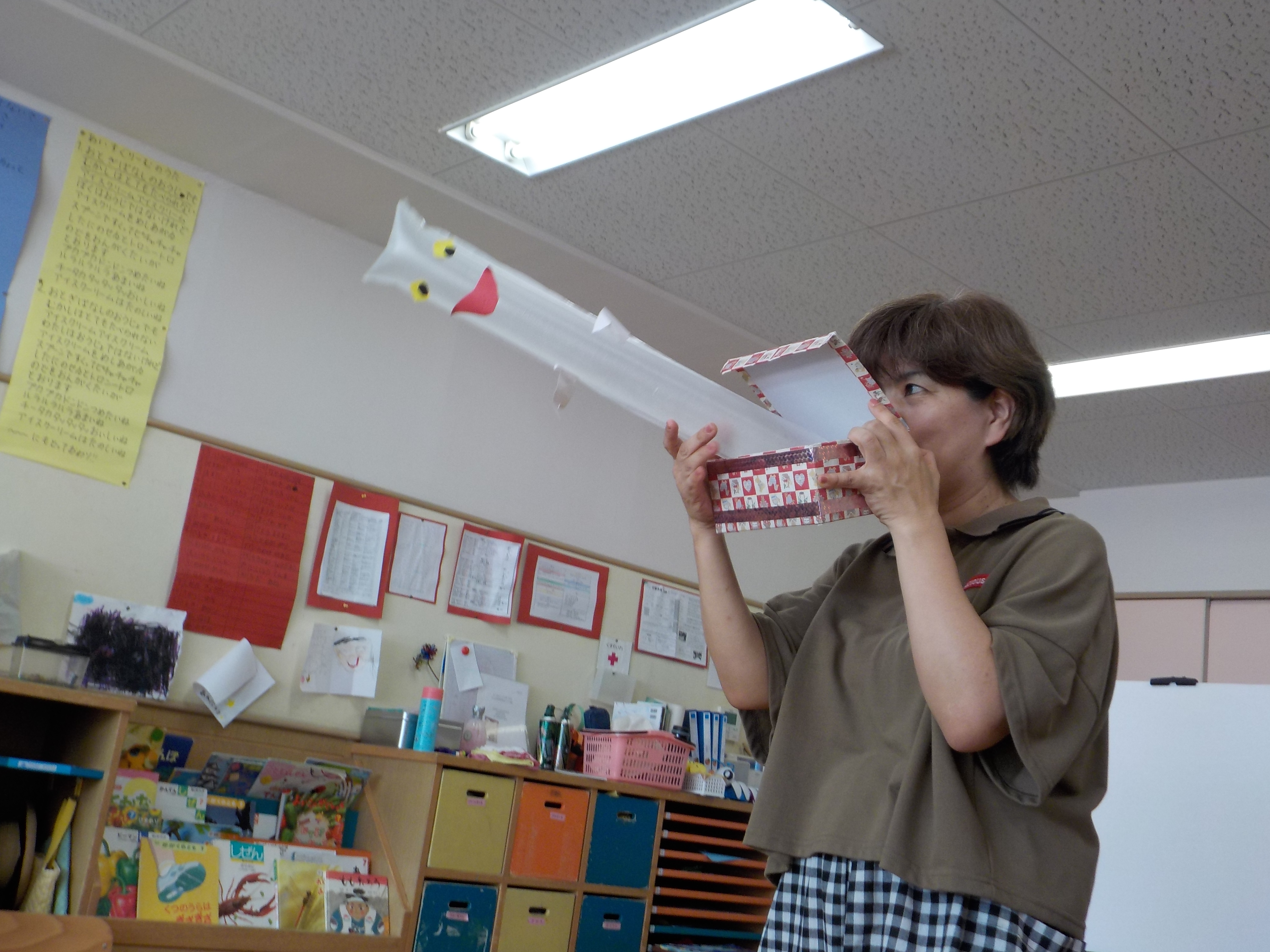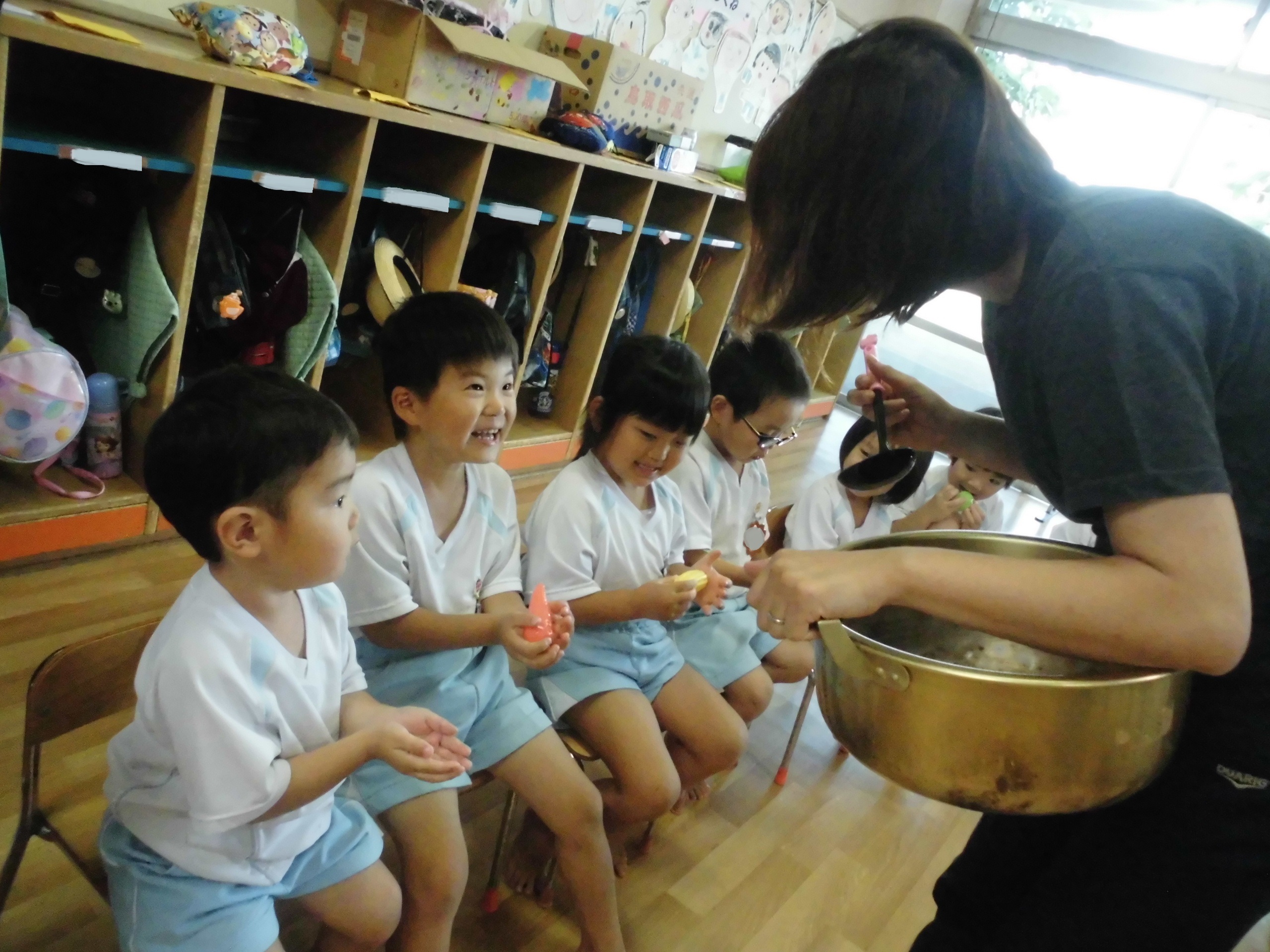 得能先生とプール遊びをしました。電車になって歩いたり、水のかけ合いこをしたりして、水への抵抗感を和らげました。身体を水に浸けてワニの動きをしながらプールの中を散歩。子ども達からは満面の笑みが溢れていました。顔付けにも挑戦。頑張る子ども達の姿はとても輝いています。「出来た」「もっと出来るようになりたい!」と遊びを通して子ども達の意欲が高まっています。
