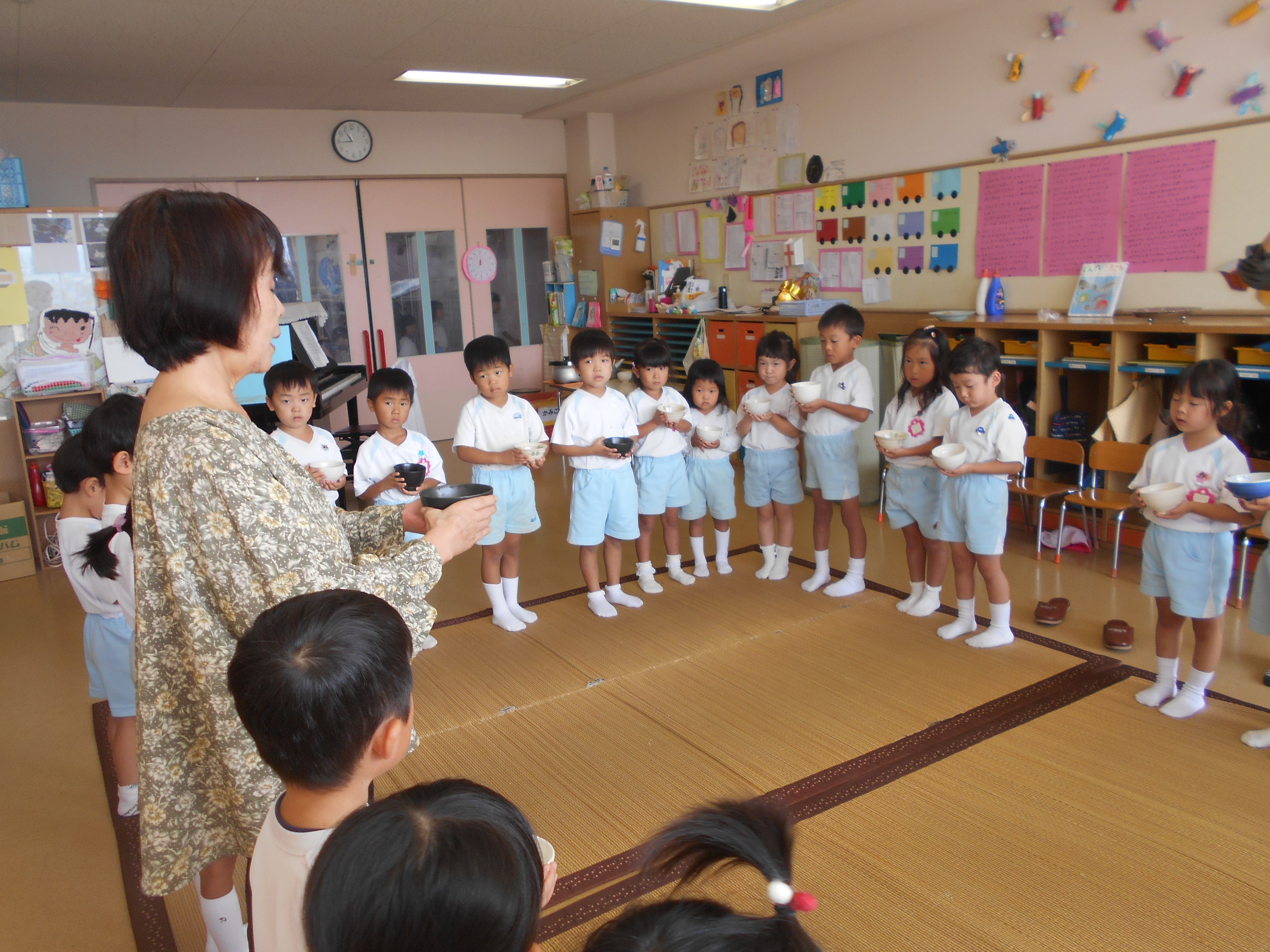 年中になって茶道が始まり、今日で4回目。今回はお茶運びの練習をしました。シーンと静まり返る部屋の中、先程まで元気に遊んでいた子ども達でしたが気持ちを切り替え、落ち着いて茶道に取り組んでいました。