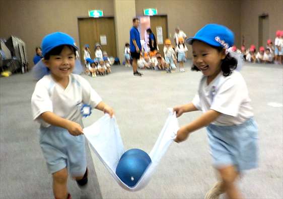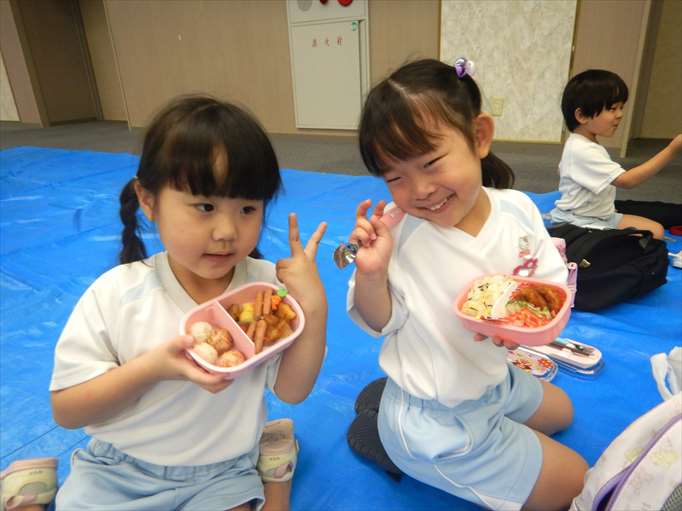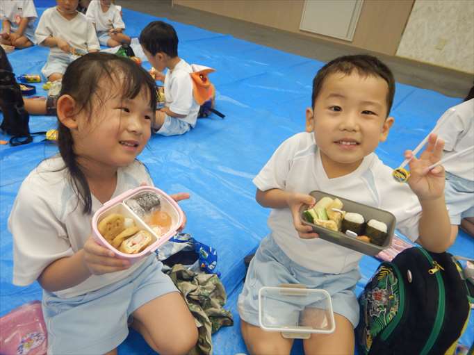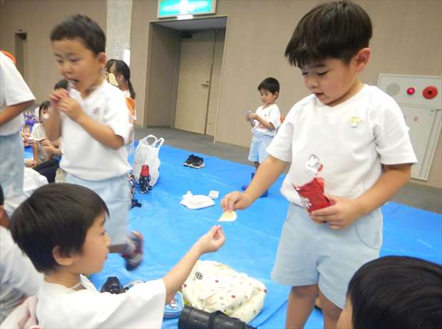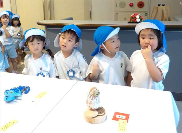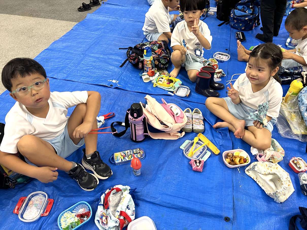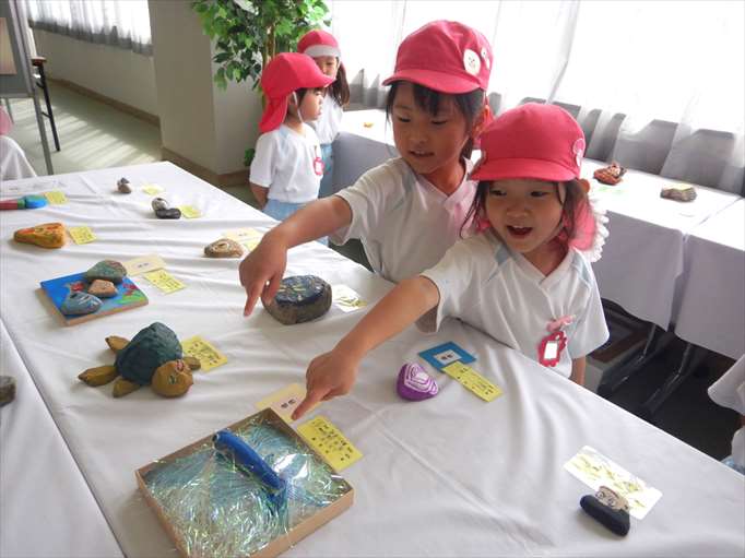 小石展では、石の形を上手く利用して、動物や魚などが作品として飾ってあり、「あー!こんなのがある。」と友達や先生と会話を楽しみながら鑑賞しました。ボール運びゲームでは、友達と協力したり、応援したりしながらクラスで対抗して盛り上がりました。お弁当やおやつは、園外で食べるといつも以上に食も進むようで、あっという間に完食でした!