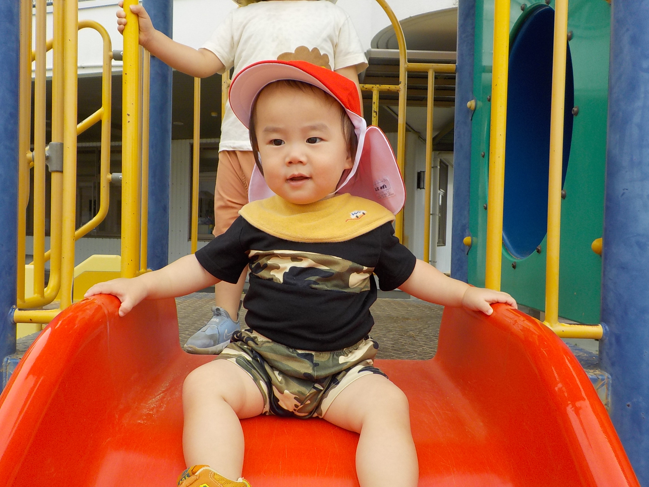 歩けるようになった子が多く、靴を履いて元気に園庭を散歩。みんなで植えた野菜に優しく触れてみたり、虫を見て「わあ~」と目が離せなくなったり。散歩の中でたくさんのことを発見し、嬉しそうに教えてくれます。「滑り台がしたい!」と保育教諭の手を引く子も多く、いつも目を輝かせてアピールしています。保育教諭と一緒に階段を一段一段慎重に上り、上手に滑り降りて、にっこり笑顔。もう一回!もう一回!と何度も滑り台へ駆けていく姿がかわいらしいです。