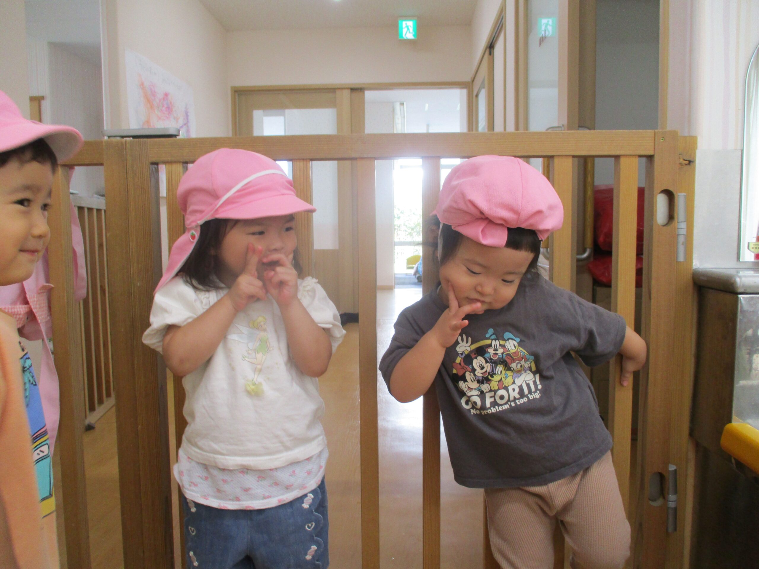 「外に遊びに行くよ!」と伝えると大喜びの子ども達。ロッカーへ一目散に向かっていき自分で帽子を手に取ると、被ってみようと挑戦します。すると、「できたよ!」と、大きな声が聞こえてきたので、見てみると”自分でできた!”という達成感を持った子ども達の自信満々な笑顔がありました。前後逆だったり、ゴムひもが頭の上に乗っていたりしていましたが”やってみよう”と、挑戦してくれた姿が嬉しかったです。
