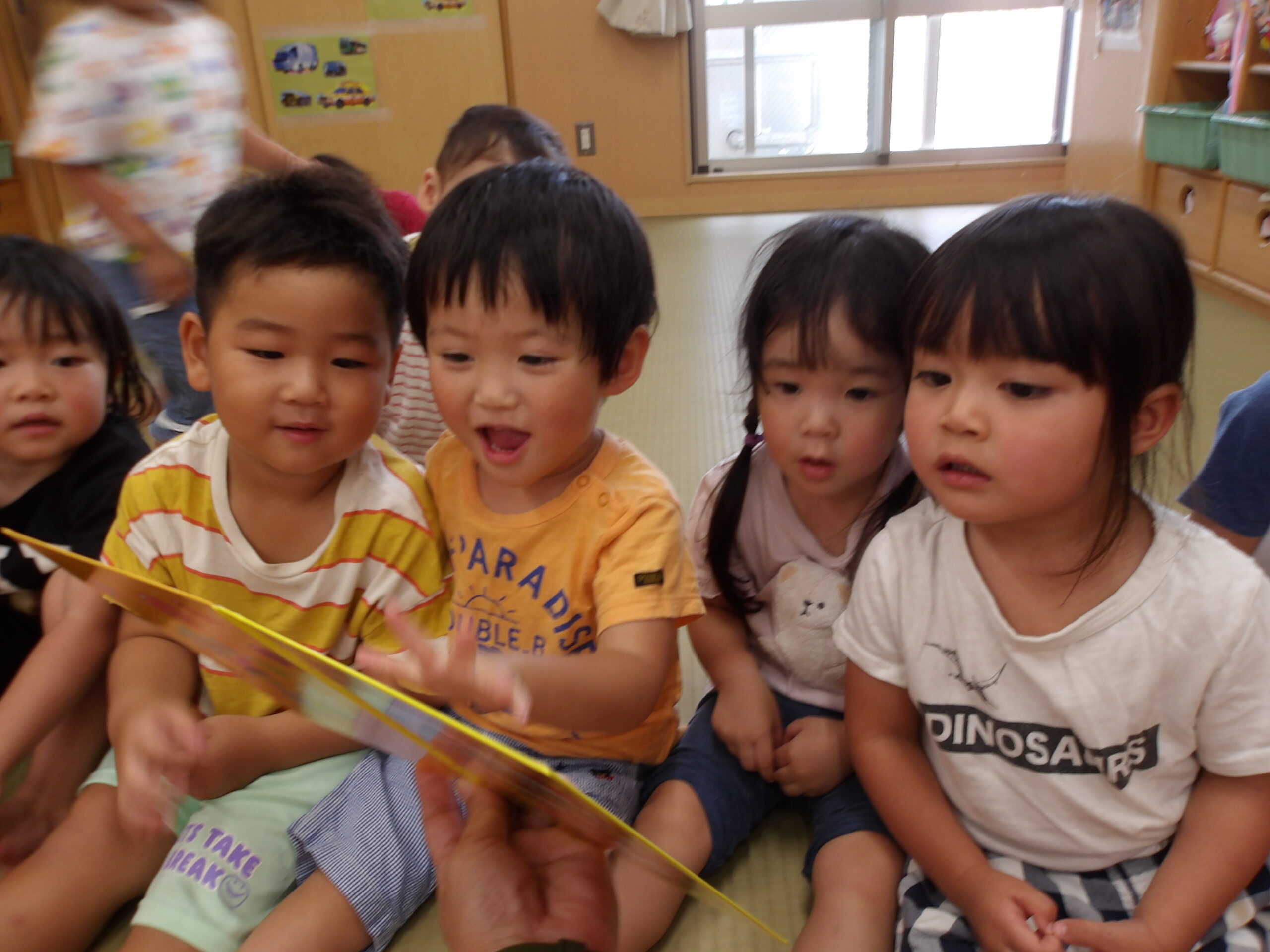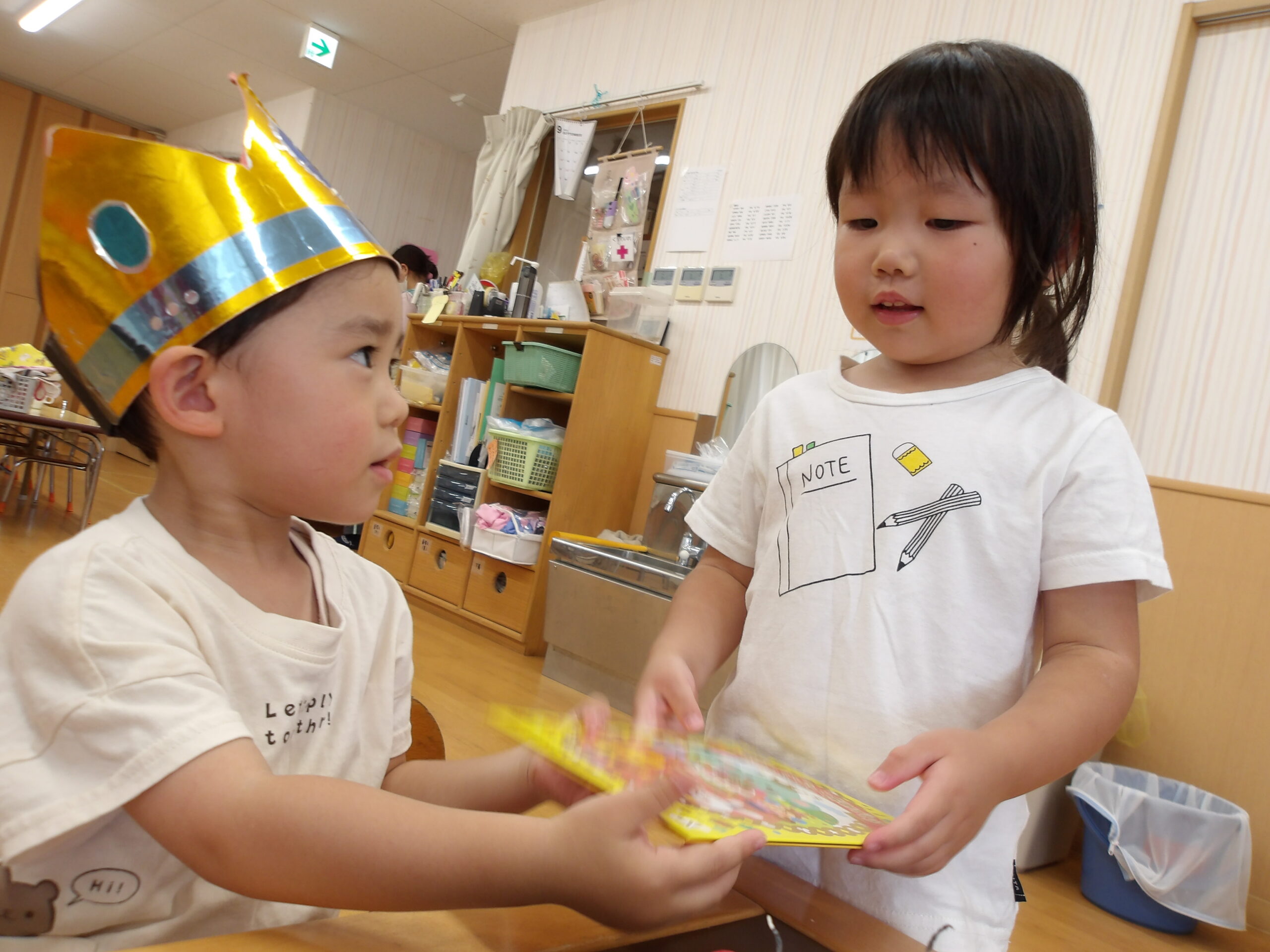 つばめAさんのお誕生会は、本物のろうそくをつけてお祝いをします。「ふぅ」と息を吹きかけ上手に消えると大きな拍手と「おめでとう」の声が部屋中に響きます。「好きな色は?」「好きな動物は?」とマイクを向けて質問をし、みんなでカードを見ます。「かわいいね」「これすべり台の所だね」と、写真を見てみんな口々に話してくれるので、お祝いしてもらう子もニコニコです。