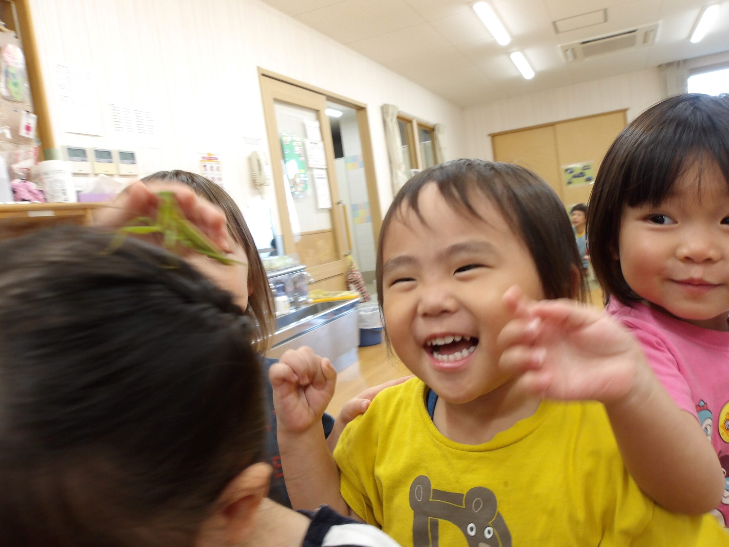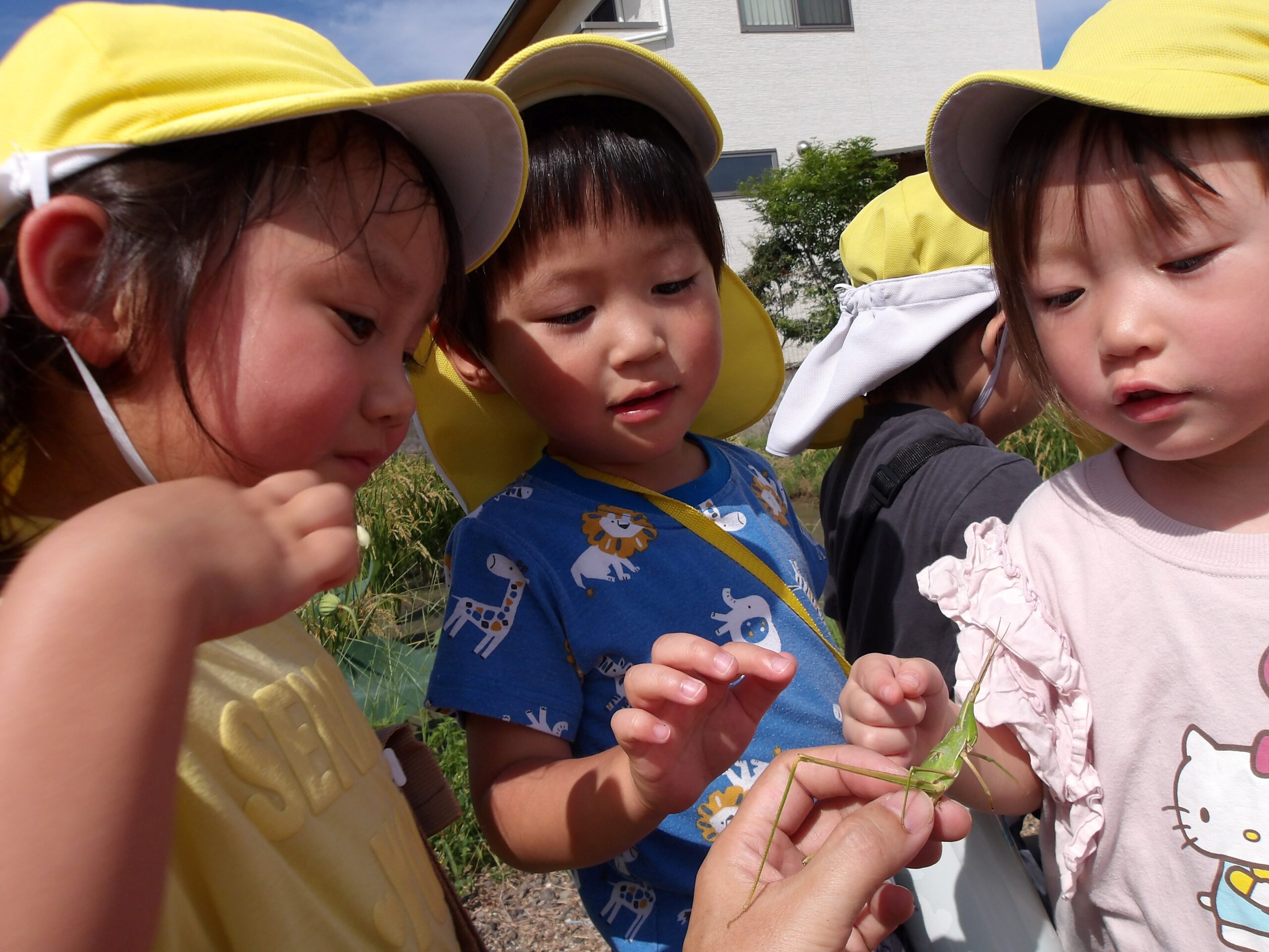 散歩でバッタを見つけ「触ってみたい」と、みんなが集まってきました。大きなバッタにびっくりしていましたが、慣れるのも早く「つんつん」と触ってみたり、「バッタさん、かくれんぼ上手だね」と、一生懸命バッタを探したり・・・。捕まえたカマキリを子ども達にくっつけてみると、なんと頭まで登ってきました。友達を助けようとみんな必死で、とてもかわいかったです。暑い暑いと言いながらも、季節は少しずつ秋に変わってきているんですね。また秋を探しに出かけようと思います。
