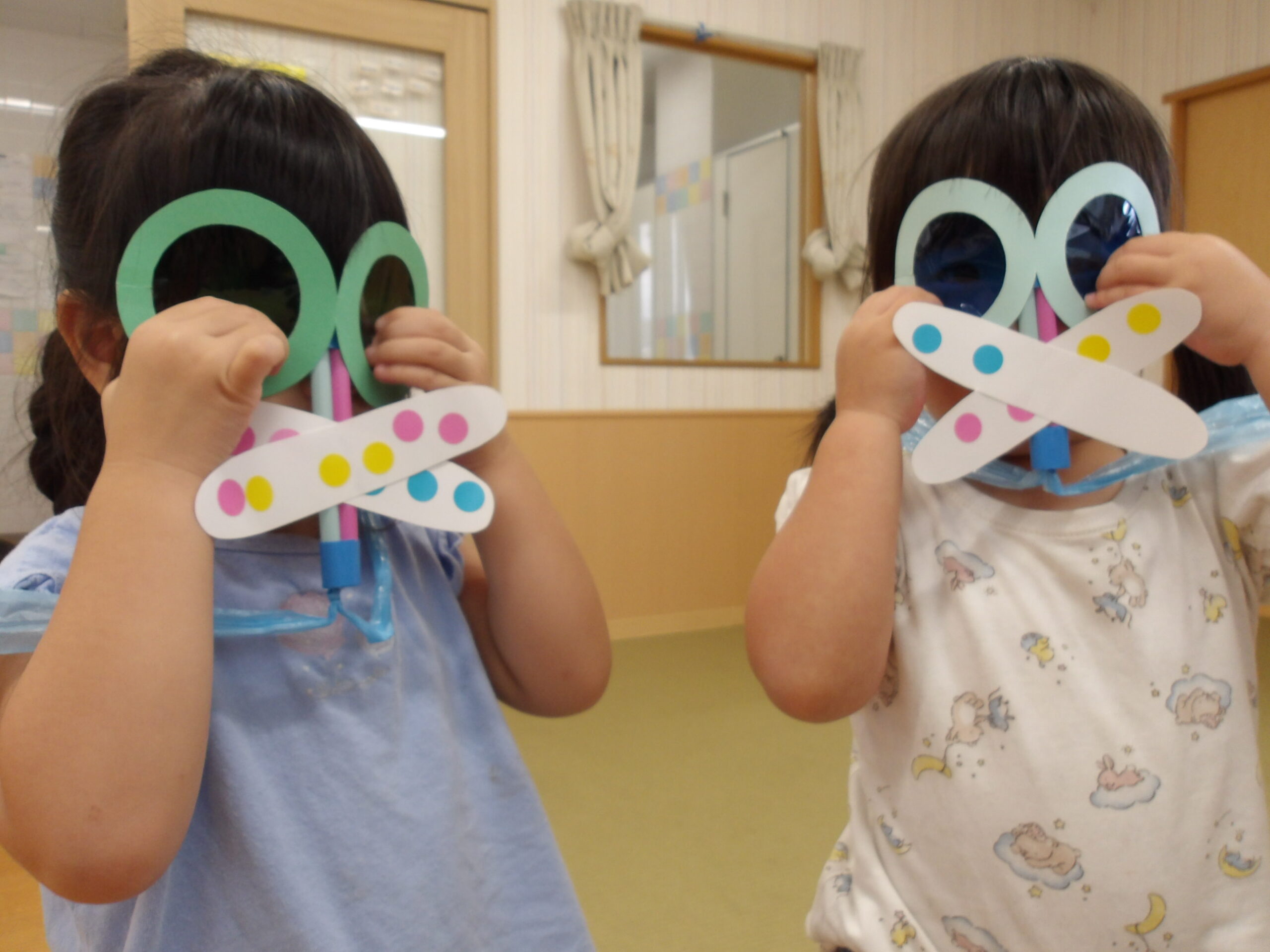 今月の曲で歌っている“とんぼのめがね”が大人気!子ども達には好きな色のタックシールを貼ってもらい、保育教諭が作った3色のとんぼの眼鏡に子ども達がタッグシールを貼り、オリジナル眼鏡の完成。家に持ち帰った後に「こんなことをしたよ!」と嬉しそうに話をする子ども達を見て、嬉しくなりました。