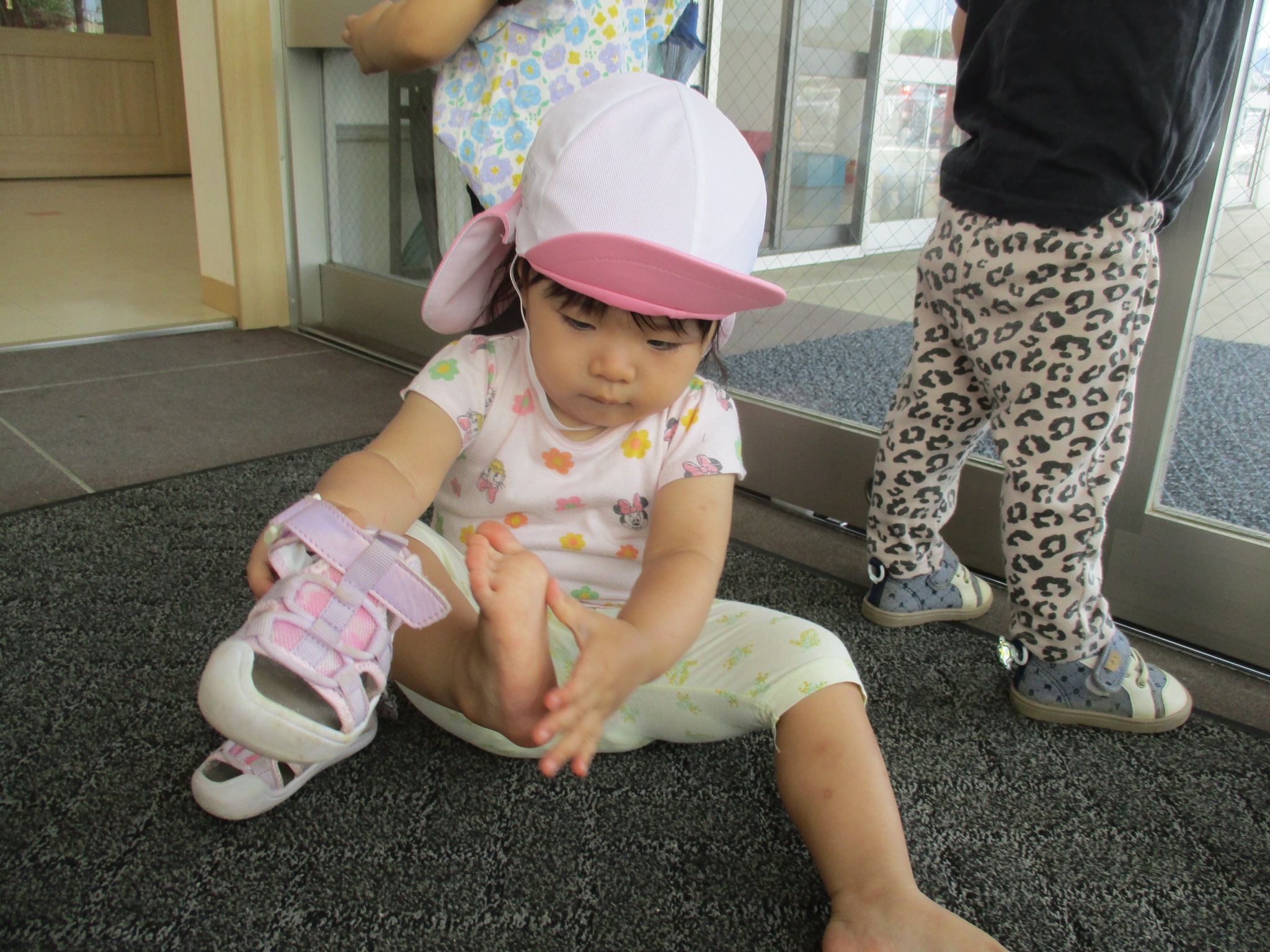 「靴を取りに行くよ!」と、声を掛けると大喜びで、靴箱に向かいます。自分の靴を持ってくると、足を片方ずつ入れようと頑張っています。出来ない時は、保育教諭の所に靴を持ってきて「して。」と伝えることが出来る様になってきました。靴の左右が反対になることもありますが、自分でやってみようとする姿が見られてきています。「できたよ!」と嬉しそうに話す姿を見ると成長を感じられます。