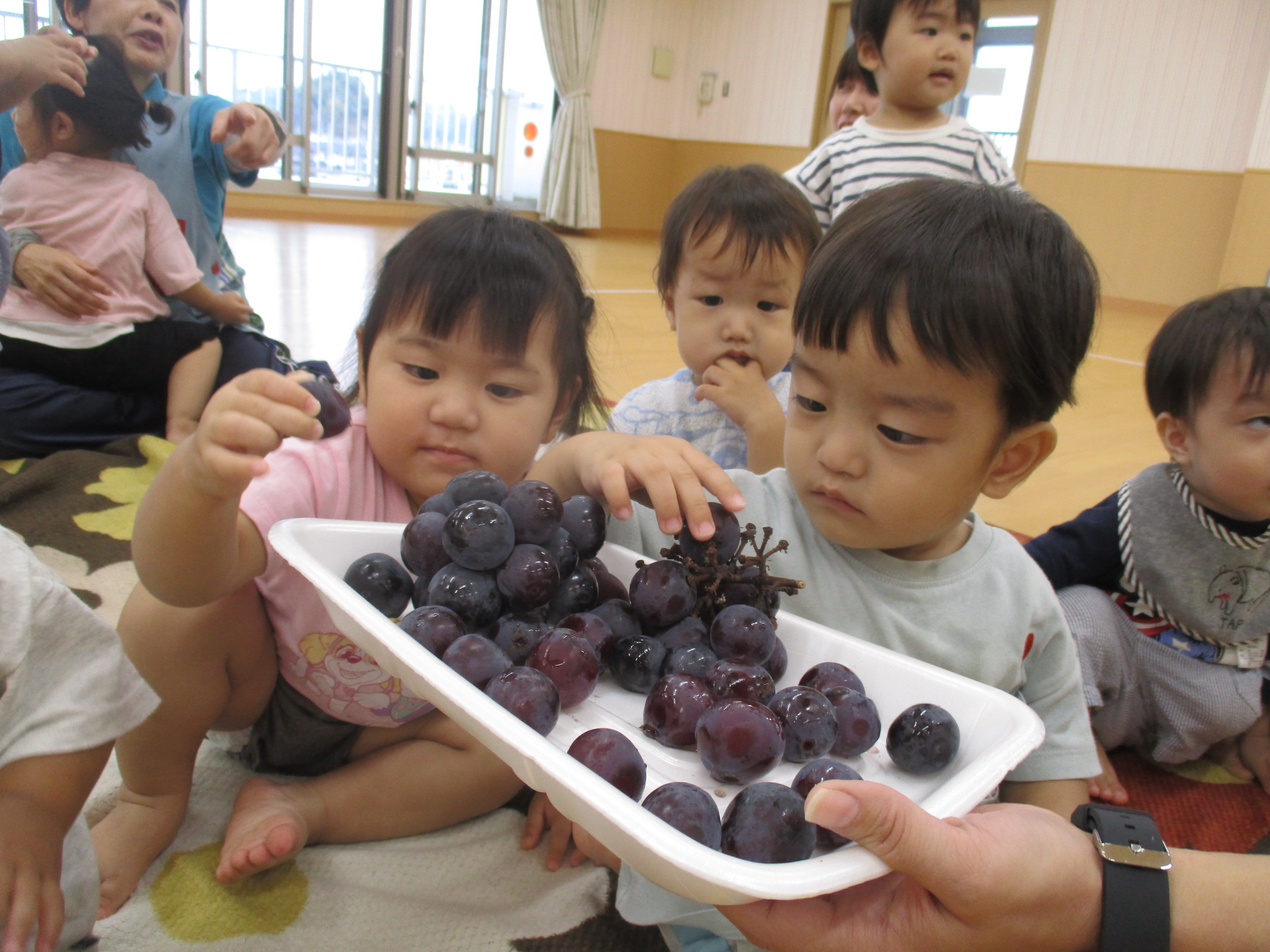 秋の食べ物について学びました。柿やさつま芋などが出てくる中で、子ども達が1番喜んだのはブドウです。ご家庭で食べた経験もあるようで、手にすると、すぐに皮を剝いてしまう可愛らしい姿が見られました。反対に、イガ栗は見た目が怖かったようで、泣いてしまう子も。美味しい食べ物がたくさん実る秋。たくさん食べて、どんどん大きくなろうね♪