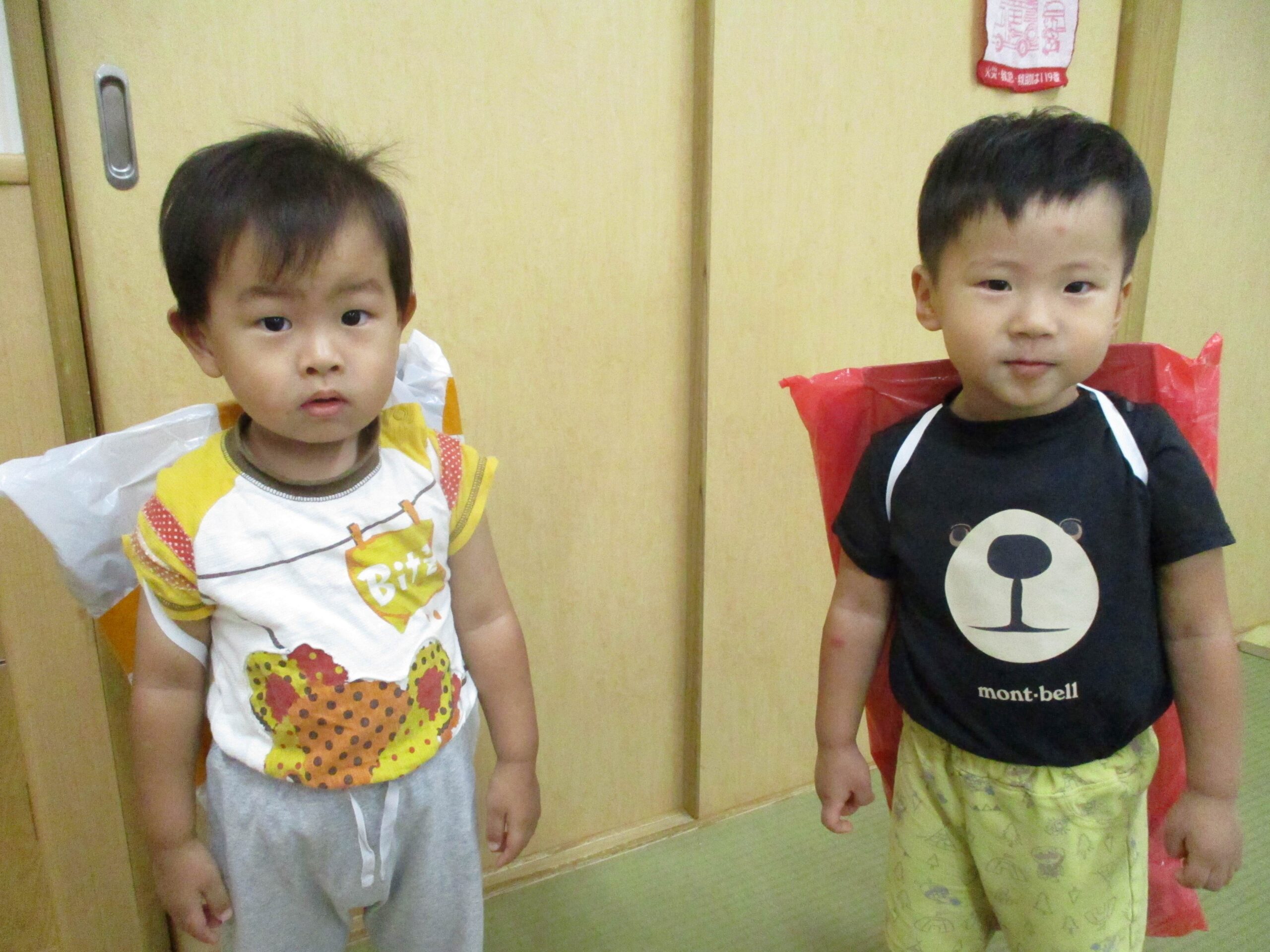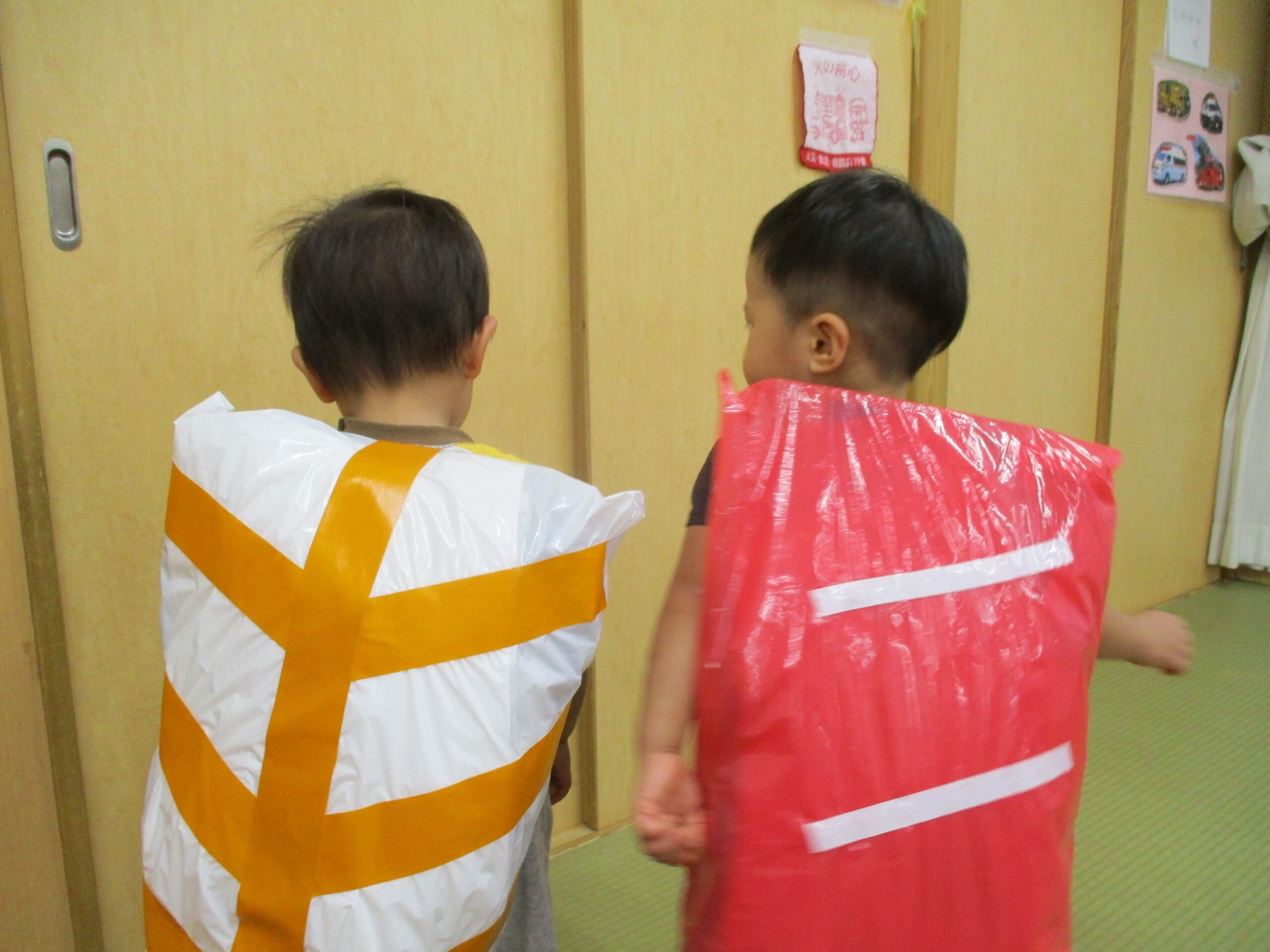 まぐろとえびのお寿司!?が並んでいます。美味しそうだなと思っていたら、なんと、ひばり組の子ども達でした!!このお寿司を見せると“背負いたい”という気持ちから「貸して!」「して!」と猛アピールしてくる子ども達。始めは背負うという行為に抵抗がある子もいました。なので、まずはお寿司の絵本や広告を見せて、お寿司に興味を持たせ、保育教諭や友達の背負う姿を見せると、子ども達の気持ちも変わり、今の状態です!ひばり組のお寿司は運動会の親子競技で披露します!!他にもサーモンとたまごがあります!どんなお寿司に変身するのか、とても楽しみです。