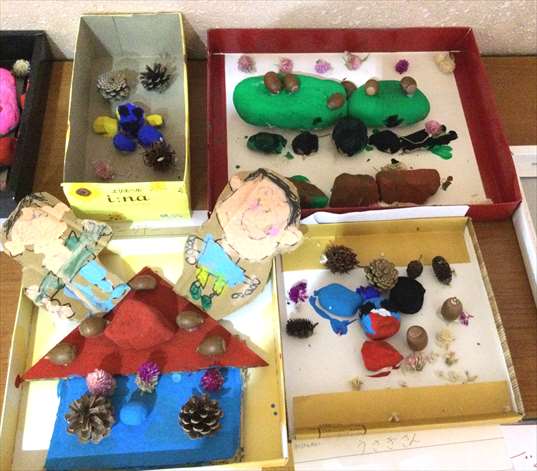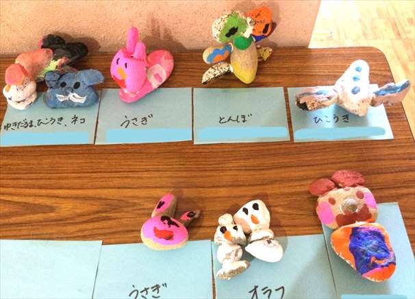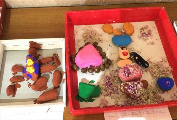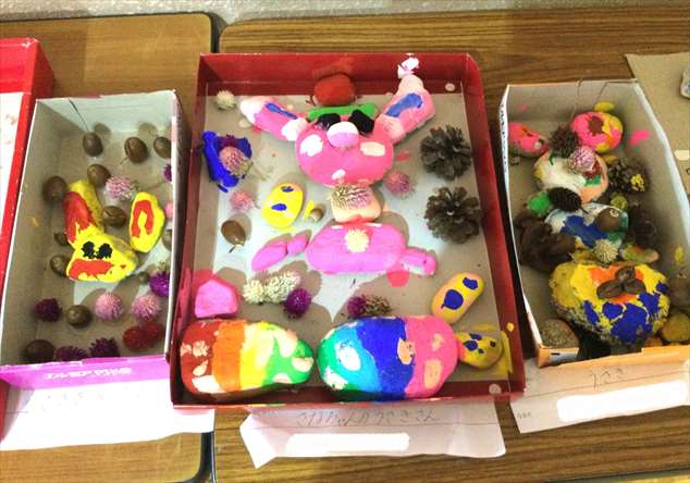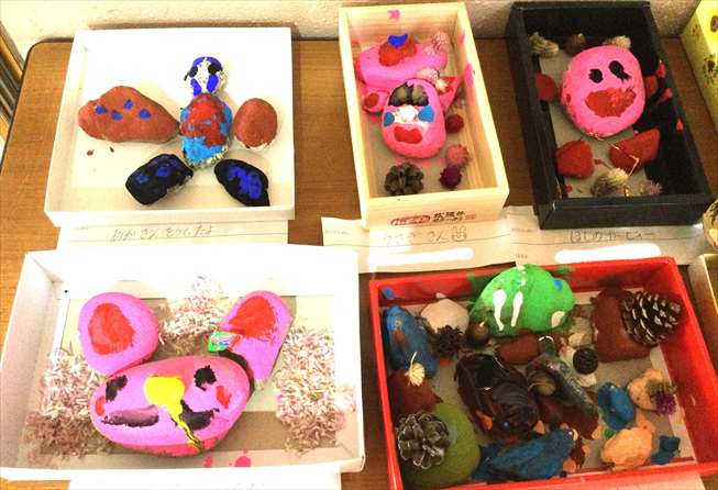先月見にいった小石展をきっかけに、自分達も石を使って素敵な作品を作りたいという思いから、後日、せせらぎ公園で小石をたくさん拾って園に持ち帰りました。その持ち帰った小石と秋の自然物を使いながら、絵の具で色をつけたり、イラストを描いたりしていろいろな物に見立てて作品作りをしました。小石の形を見て何を作ろうか想像したり、自分の作りたい物のイメージを膨らませたりしながら描くことで、個性ある作品作がたくさん出来あがりましたよ!