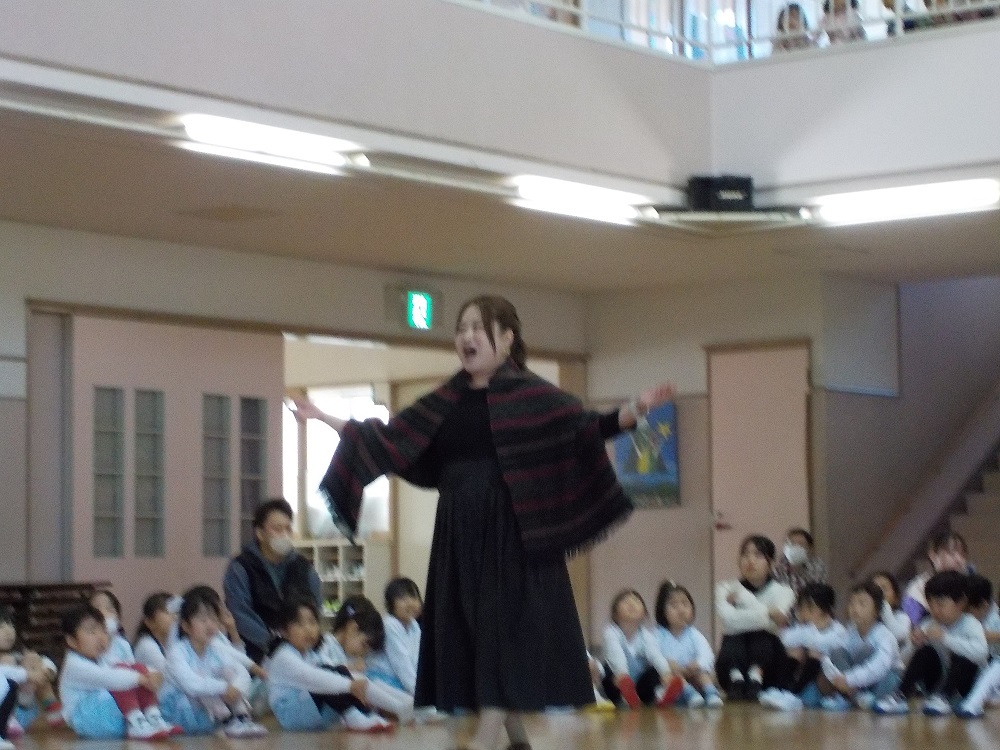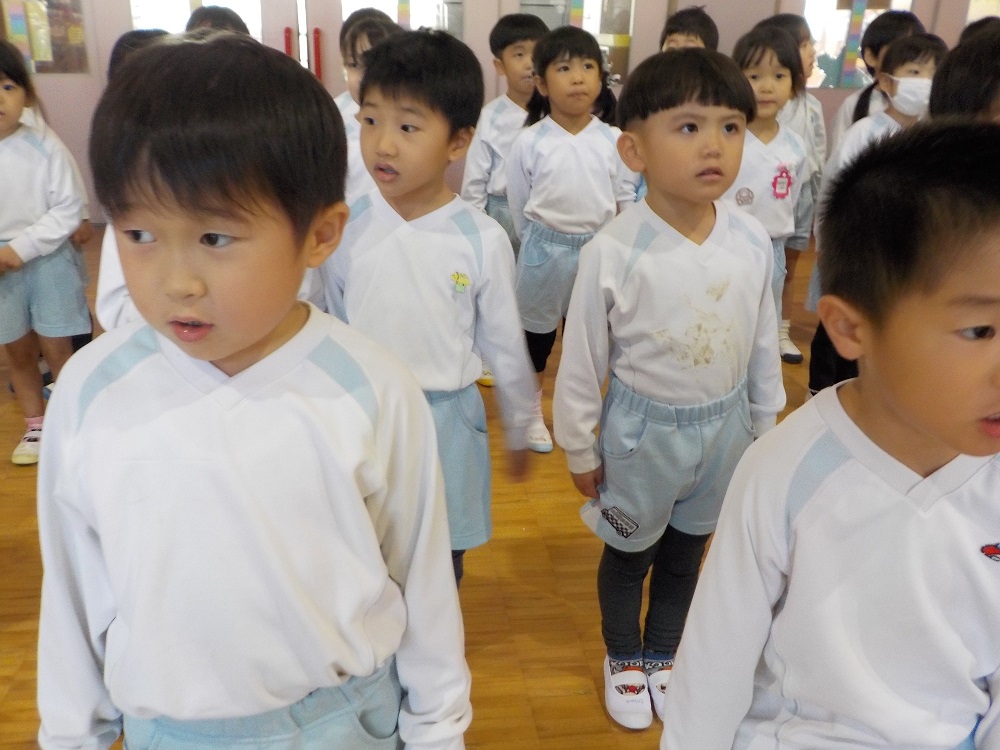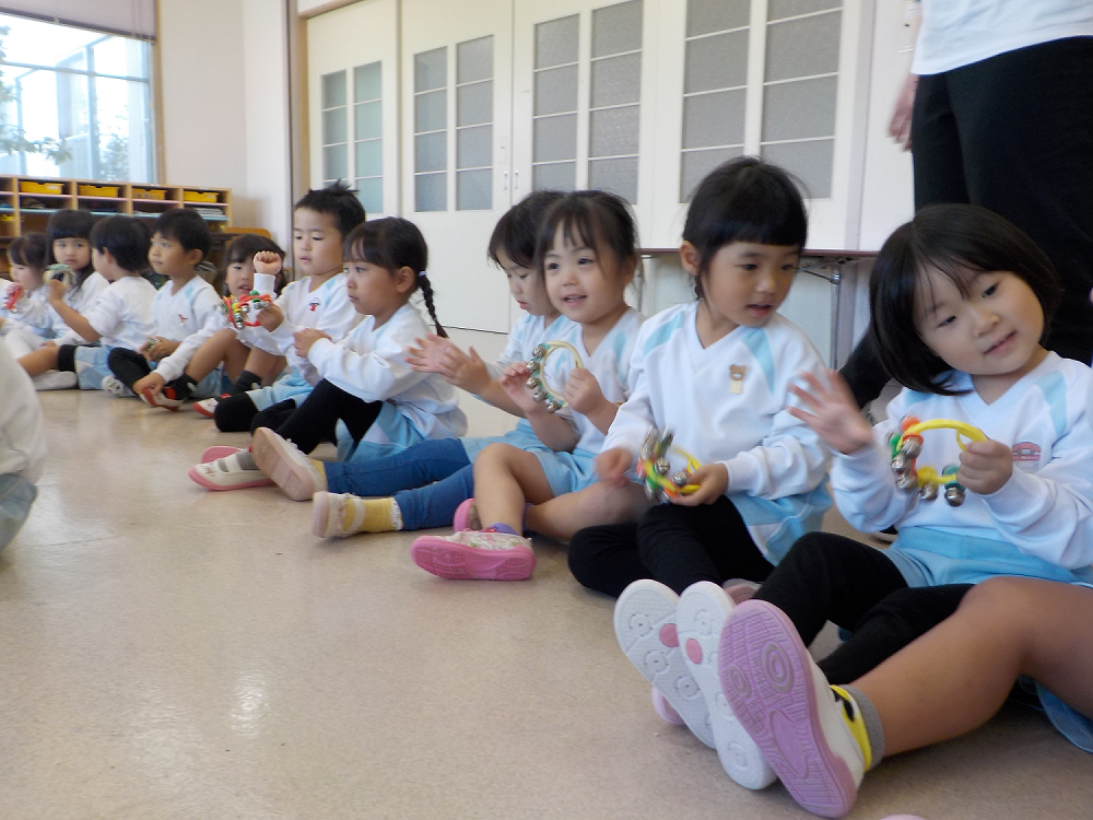 みずよ先生の素敵なピアノとみちこ先生の迫力のある歌声から始まりました。今日はフランス語で歌う「宝石のうた」でした。日本語とは違うこともあり耳を澄ませて真剣に聴いていました。来月は発表会!発声練習、歌う姿勢もばっちりです。年少は楽器の正しい使い方を教えてもらいました。トライアングルや鈴は初めて触る子もいて、ドキドキしながら音を出していました。