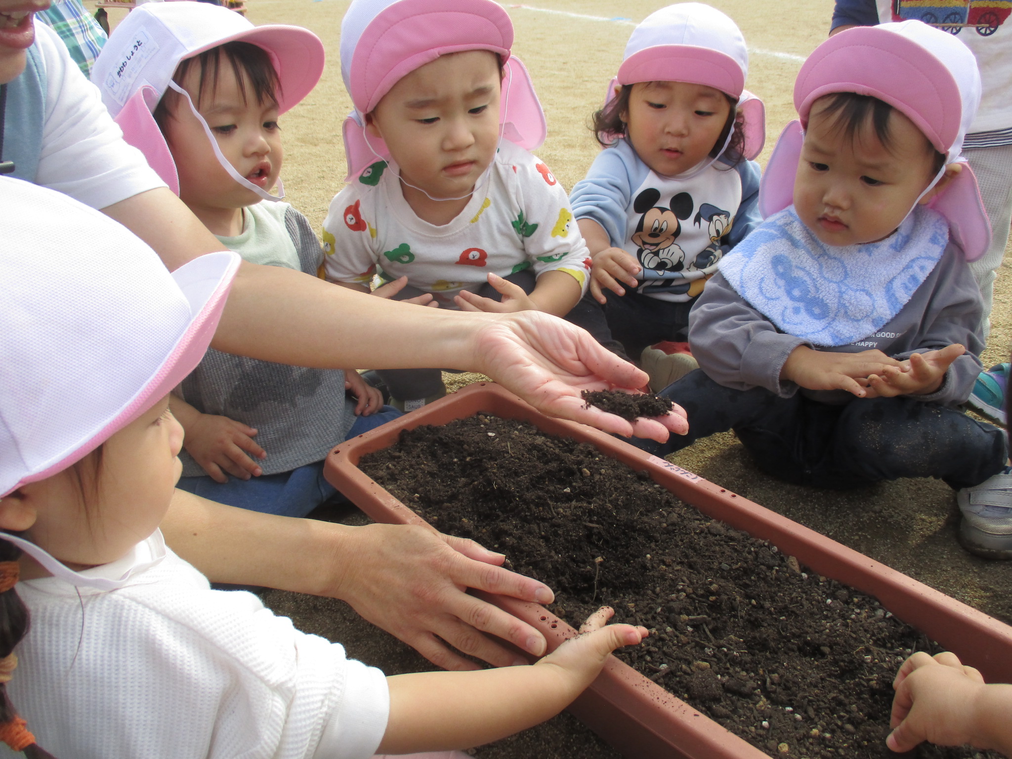 冬野菜の種蒔きをしました。保育教諭の手の上にある小さな種をじっくりと観察して興味津々の様子。夏野菜を植えた時に比べ、積極的に手伝いをしてくれる子ども達。時に日頃の砂遊びの成果を発揮しながら思い切り土を掘る姿も見られましたが、最後は優しく土のお布団を掛けて任務完了!大好きな象さんジョウロで水遣りも楽しみました。収穫する時の反応が今から楽しみです♪