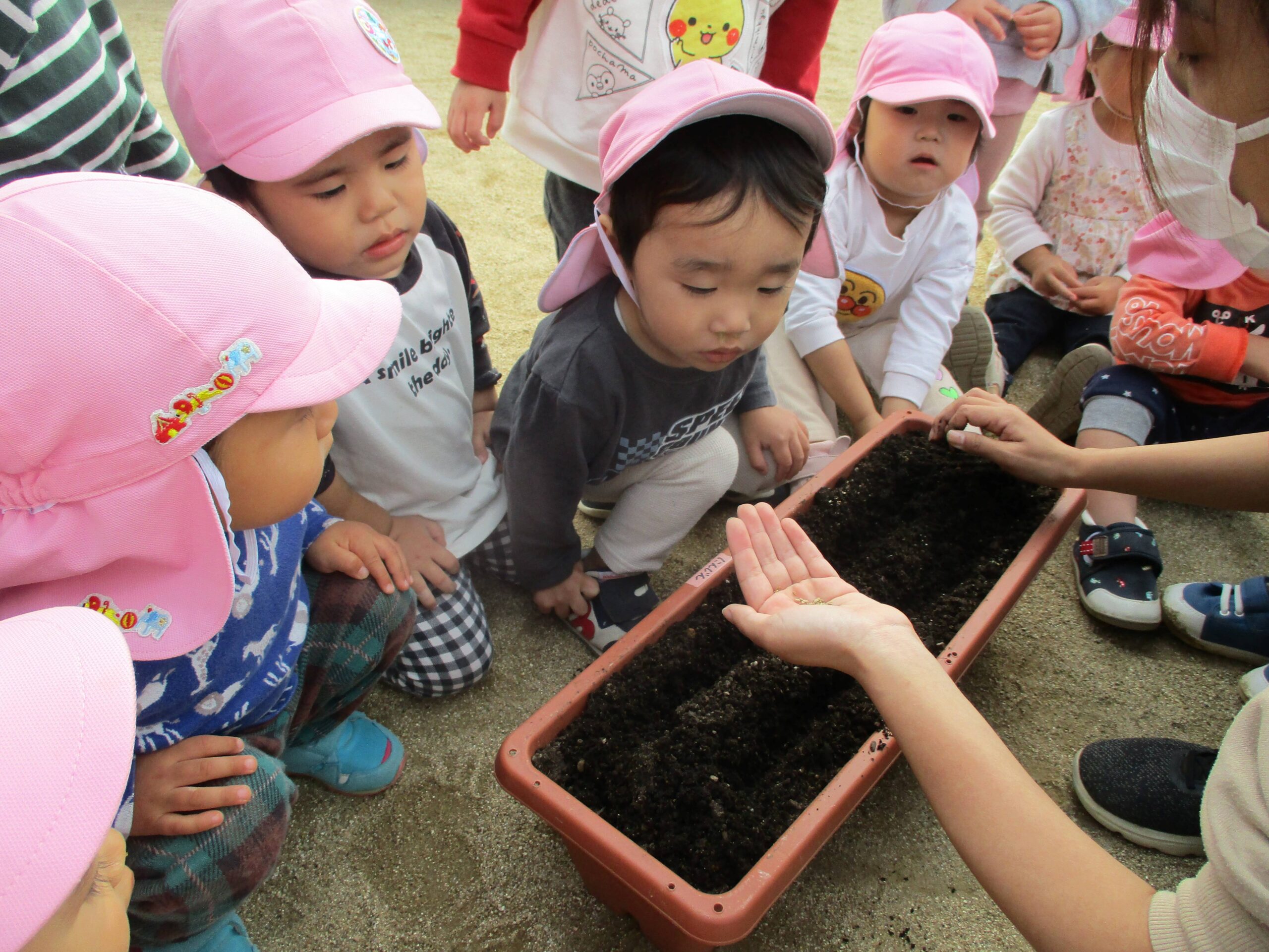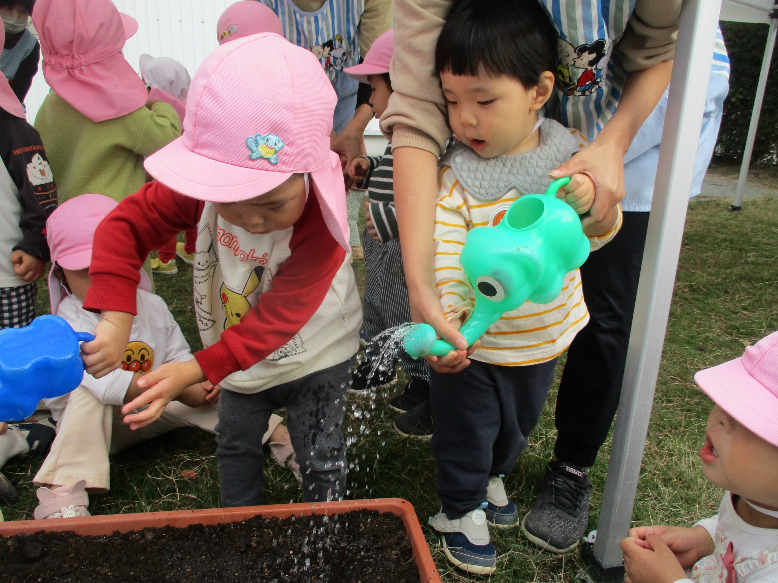 ニンジンの種蒔きをしました。保育教諭が「ニンジンの種を蒔くよ。」と伝えながら持ってきた種が茶色なのを見て「先生ちがうよ?」と、不思議そうな子ども達。「これはニンジンの赤ちゃんで、土の中で大きくなったらオレンジ色に変身するんだよ。」と伝えると「えー!?」と驚きの表情でした。種蒔きの後はみんなで「大きくなあれ♪」と、願いを込めながら水やりをしました。夏野菜に続き冬野菜の生長もみんなで楽しんでいきたいと思います。