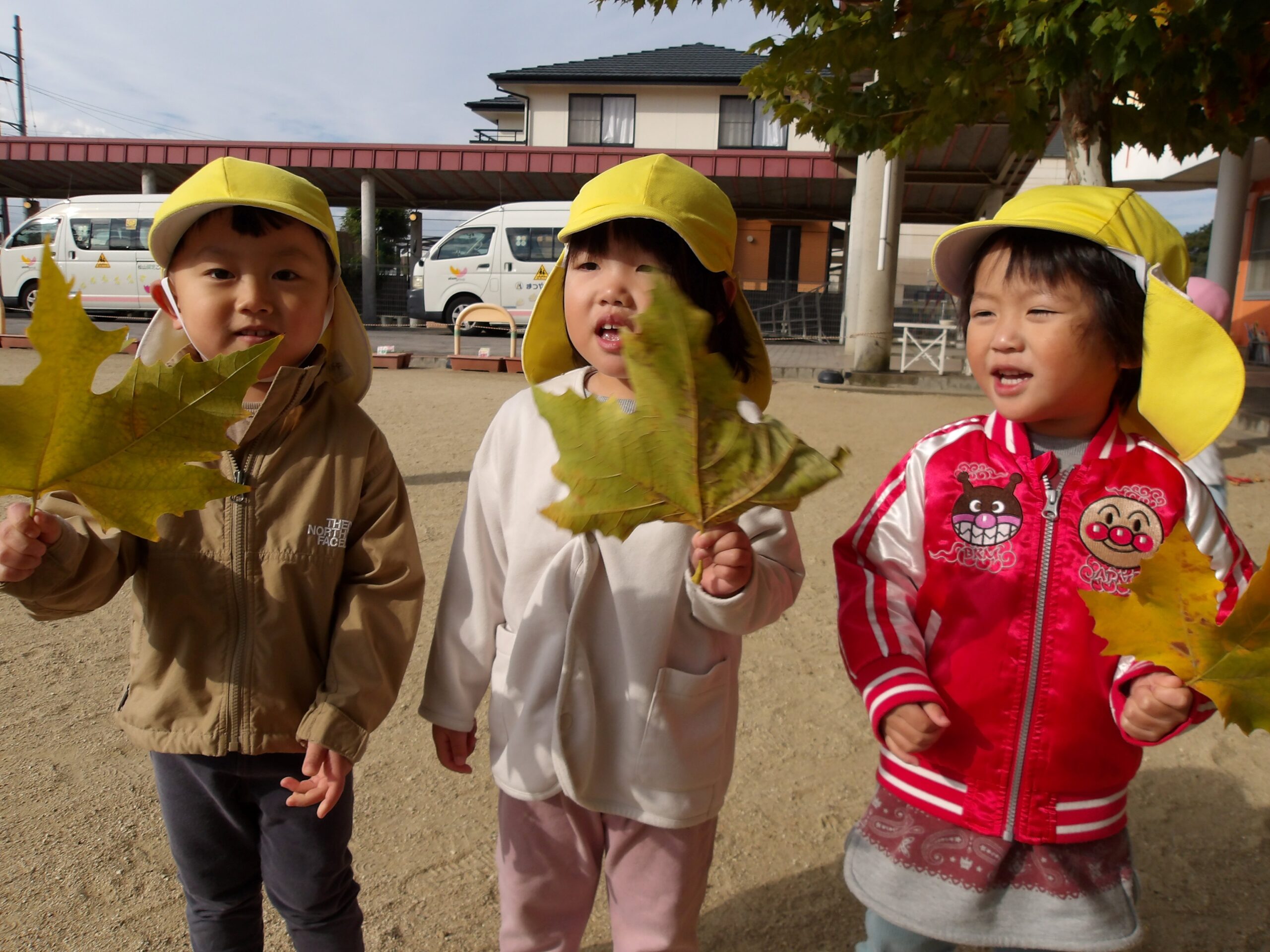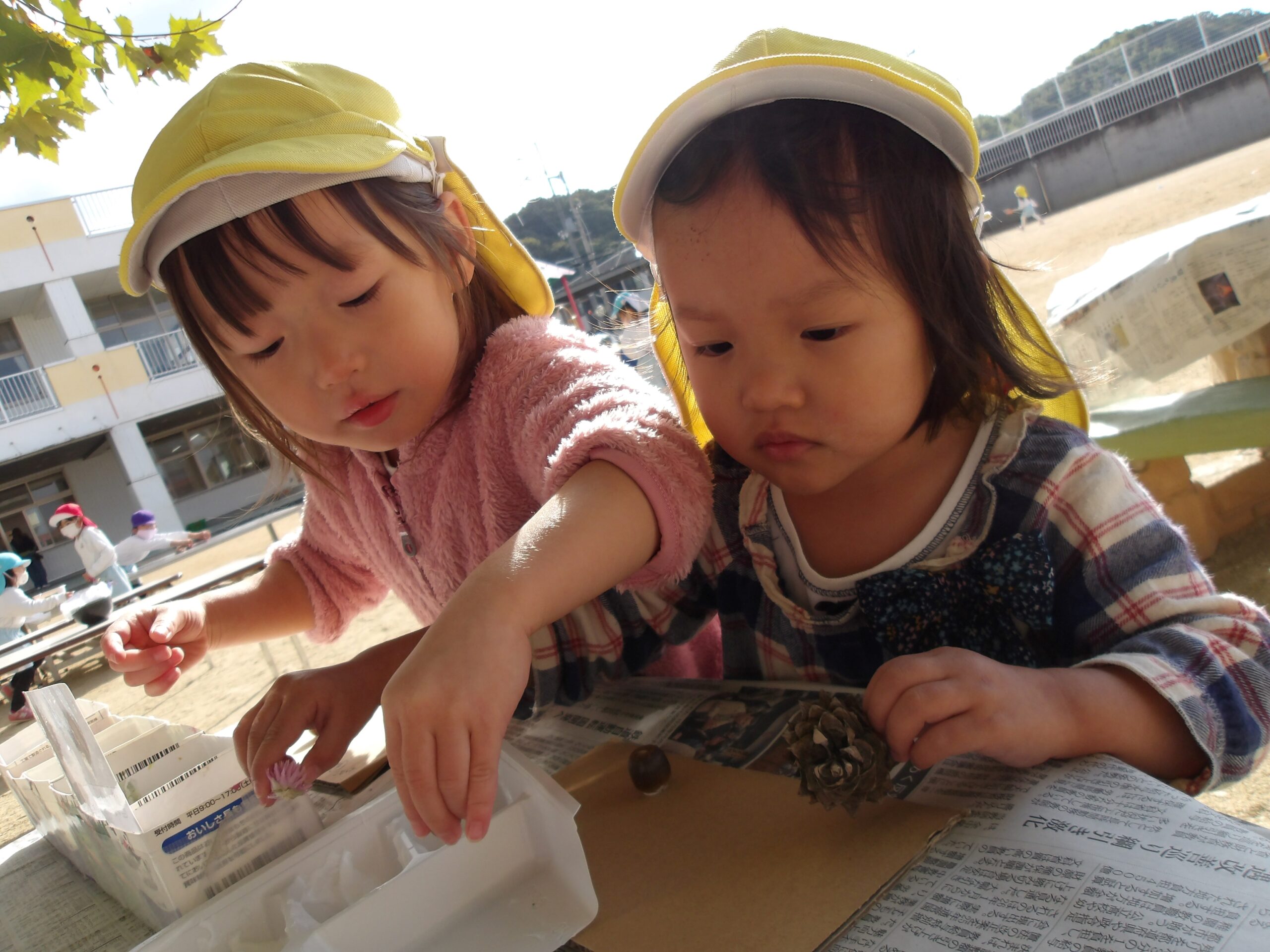公園で拾ってきた落ち葉や木の実を段ボールに貼る自然物遊びが盛り上がっています。保育教諭が「こうする?」と、提案すると、「こっちがいいよ」と少しずつ自分の思ったことを素直な言葉で表現できるようになりました。自分の作品ができあがると、「ママに見せたい」と、持ち帰るのもワクワクです。「明日はこれする。」と、翌日の遊びに意欲いっぱい。まだまだいっぱい遊ぼうね!