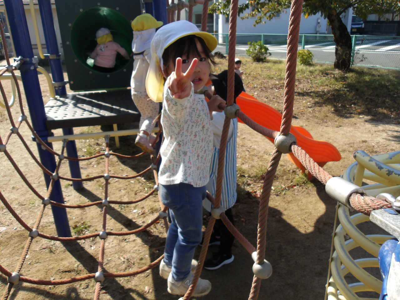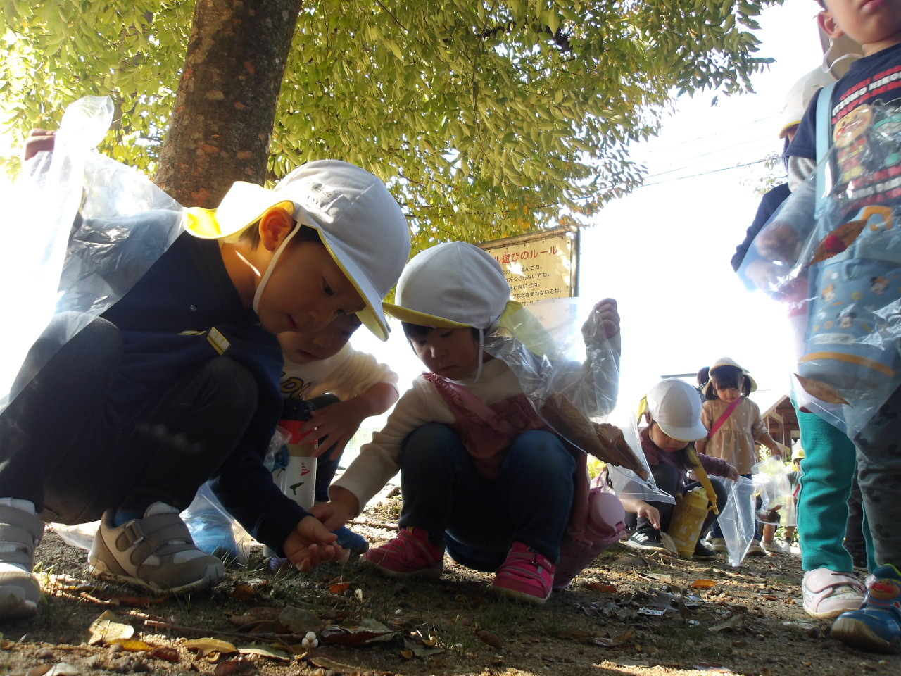 運動会を頑張ったつばめ組さん。散歩の前日から「明日は、つばめA組と一緒に星岡公園に行くよ!」と伝えていたため、当日、「今日は公園行くの?」「バス乗る?」とワクワクした表情の子ども達でした。友達と手をしっかり繋ぎ、いつもとは違う道を歩いて公園へ。時間いっぱい遊具で遊び、帰る前には落ち葉拾いをしました。拾った落ち葉は散歩のお土産に!「お母さん、お父さんに見せる。」と夢中で拾っていましたよ。日差しが照りつける中、頑張って歩きました。