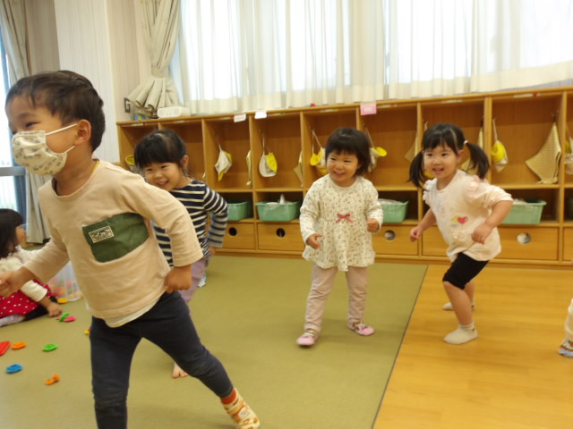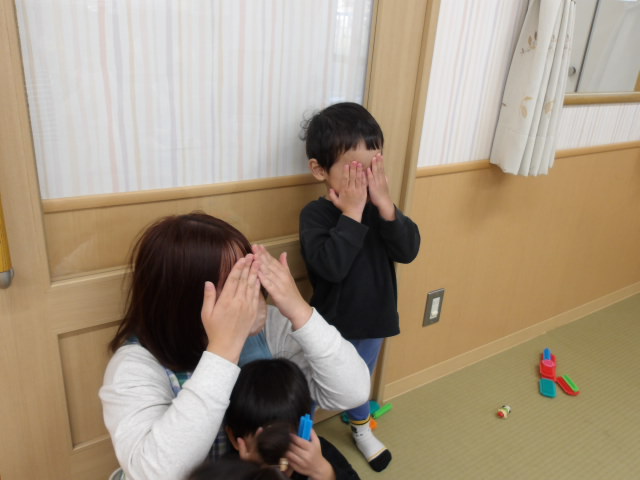 子ども達から「“だるまさんがころんだ”しよう!」とゲームのお誘い。初めは保育教諭が鬼役で子ども達が動いていましたが、「“だるまさんがころんだ”って言いたい!」と言う子もいたため、保育教諭が傍について一緒にしてみました。ルールをしっかり理解し、全員で楽しみながら参加することができました。最近は、椅子取りゲームや神経衰弱などルールのあるゲームをみんなで一緒に楽しんでいますよ。