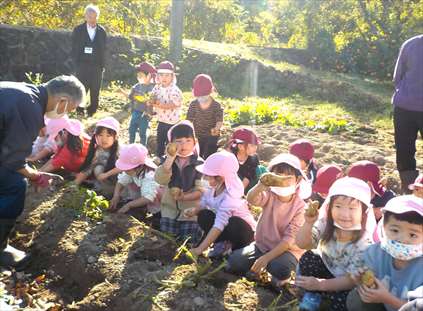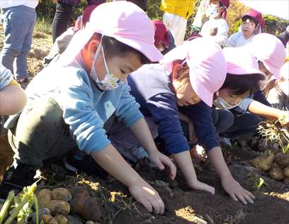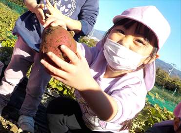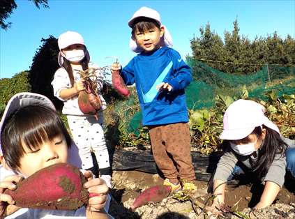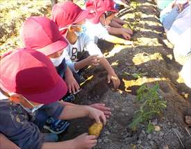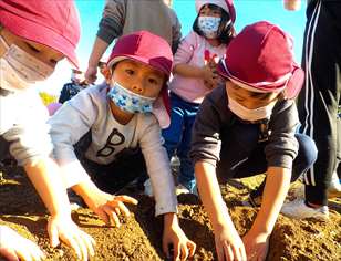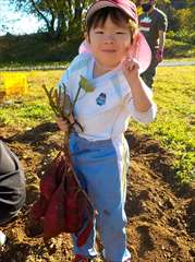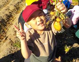 楽しみにしていた、自然体験!バスの中では、「もうすぐつく?」とワクワクしていました。「沢山掘るぞ!」「大きいのがいいな!」と話も弾んでいました。最初はじゃがいもほりに挑戦。「どこにあるの~?」「じゃがいもの葉っぱがあった!」と、やる気スイッチが入ると腕捲りをして、次は、さつま芋掘りスタート!土が固くなかなか掘り出せず困っている友だちがいると、周りの子ども達が手伝いをする姿が見られました。声を合わせて「せーの!せーの!」と言いながら頑張っていました。収穫時には「やったー!取れた!」「先生、見て!」と、達成感を得ていました。土まみれになりながらも、一生懸命ほって、みんなの顔は最高な笑顔になっていましたよ!