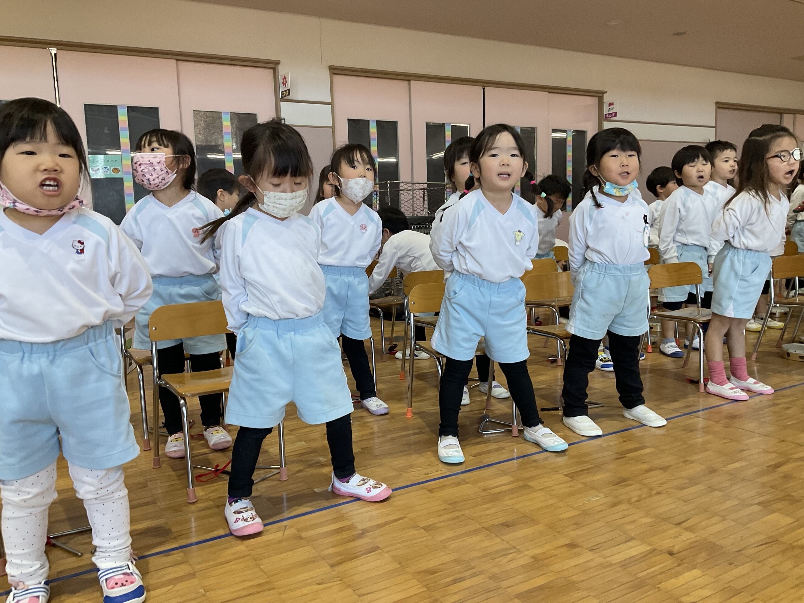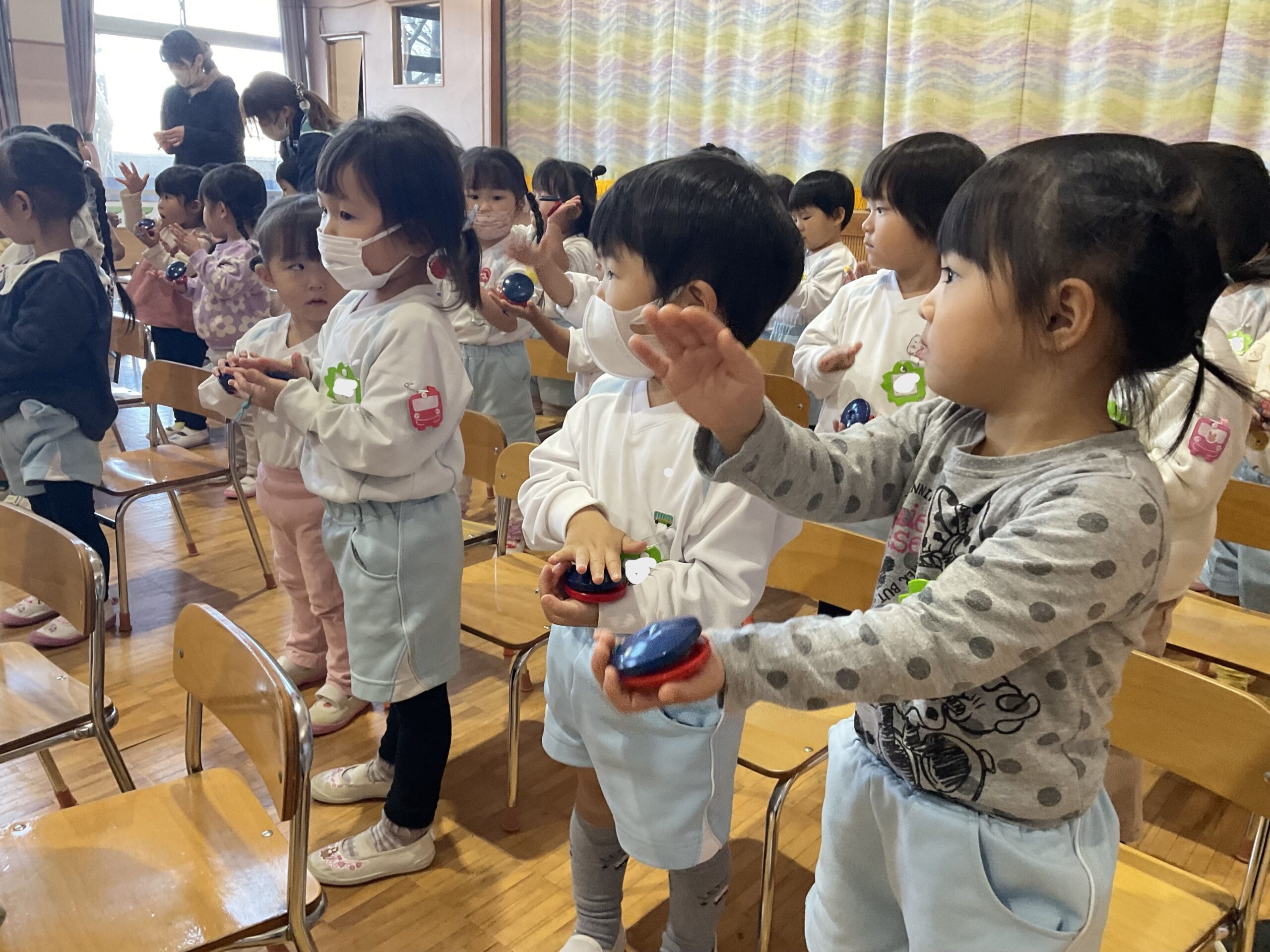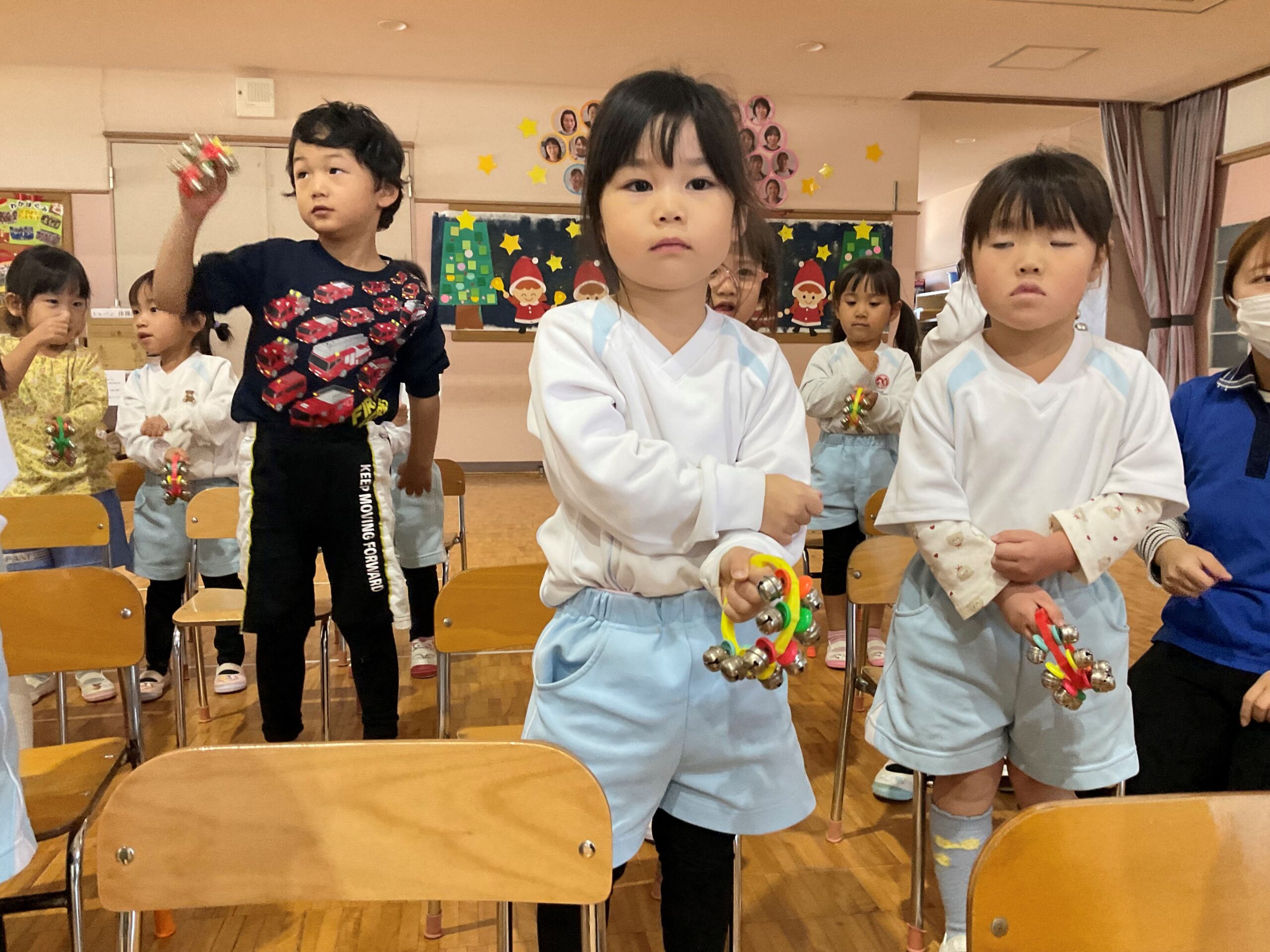 今年最後の集会は、いつも歌う『おはようのうた』、「今日は手拍子にする?ジャンプにする?」と聞かれ、「ジャンプ!!」と元気よく返事をして音楽集会の始まり!本日演奏してくれる曲を発表される時には、「クリスマスの歌じゃない?」と楽しみにしている声が聞かれました。『ジングルベル』が始まると口ずさんだり、身体を揺らしたりして楽しんでいました。楽器遊びでは『赤鼻のトナカイ』に合わせて、カスタネット・トライアングル・すず・タンバリンに分かれて演奏の始まり!友達と目を合わせながら鳴らし、演奏を楽しんでいました。