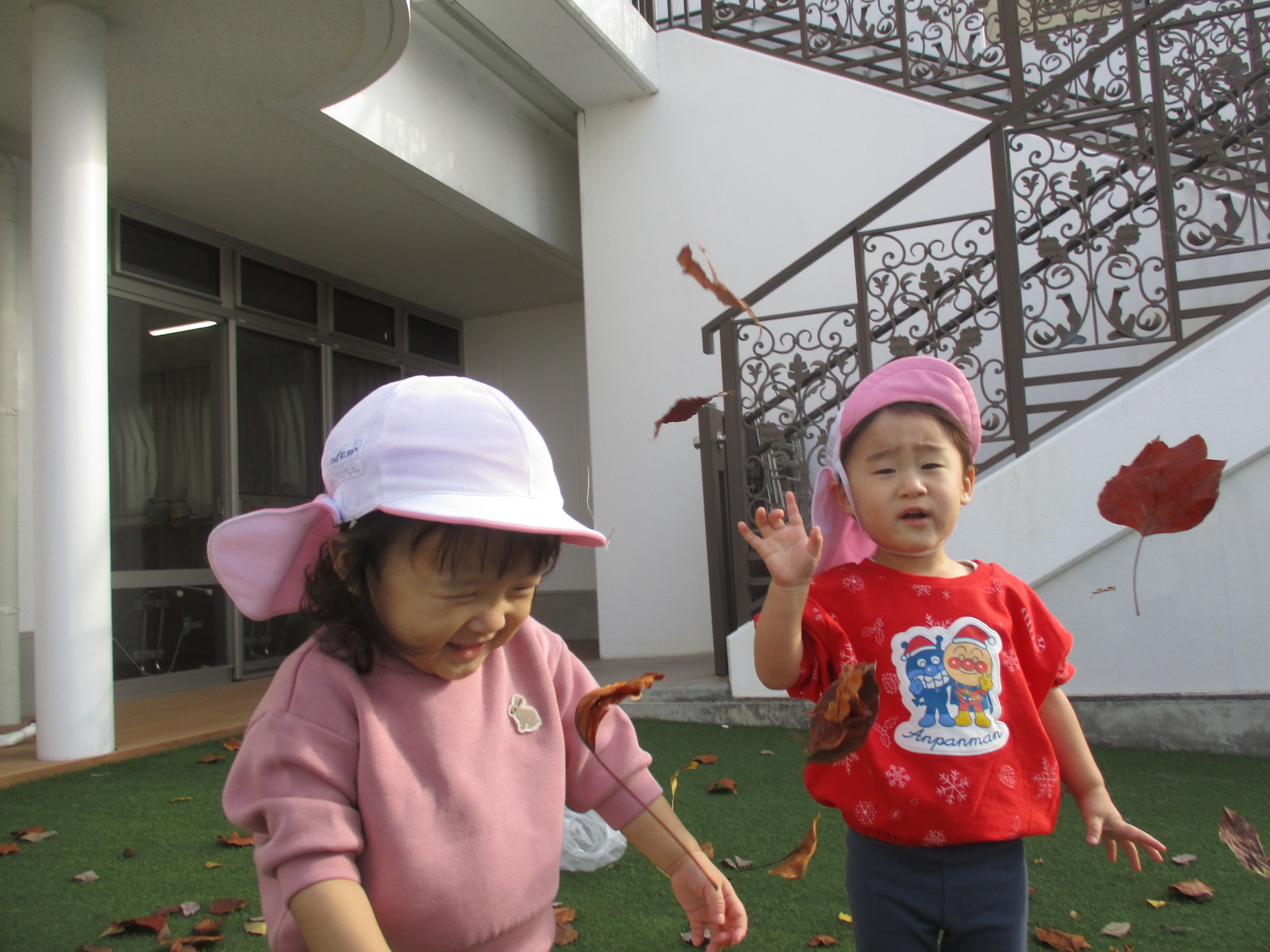 風のおかげで、落ち葉がたくさん拾える季節になりました。そのため、テラスに落ち葉や松ぼっくりを撒いてみると、準備の段階から窓に張り付いて、「まだかな~。」と様子を見守る子ども達。保育教諭と一緒に葉っぱのシャワーを楽しんだり、小さくちぎりながら音や感触を楽しんだりして大満喫。大きな葉っぱを集める子、赤や黄色を好んで集める子など、個性も見られました。