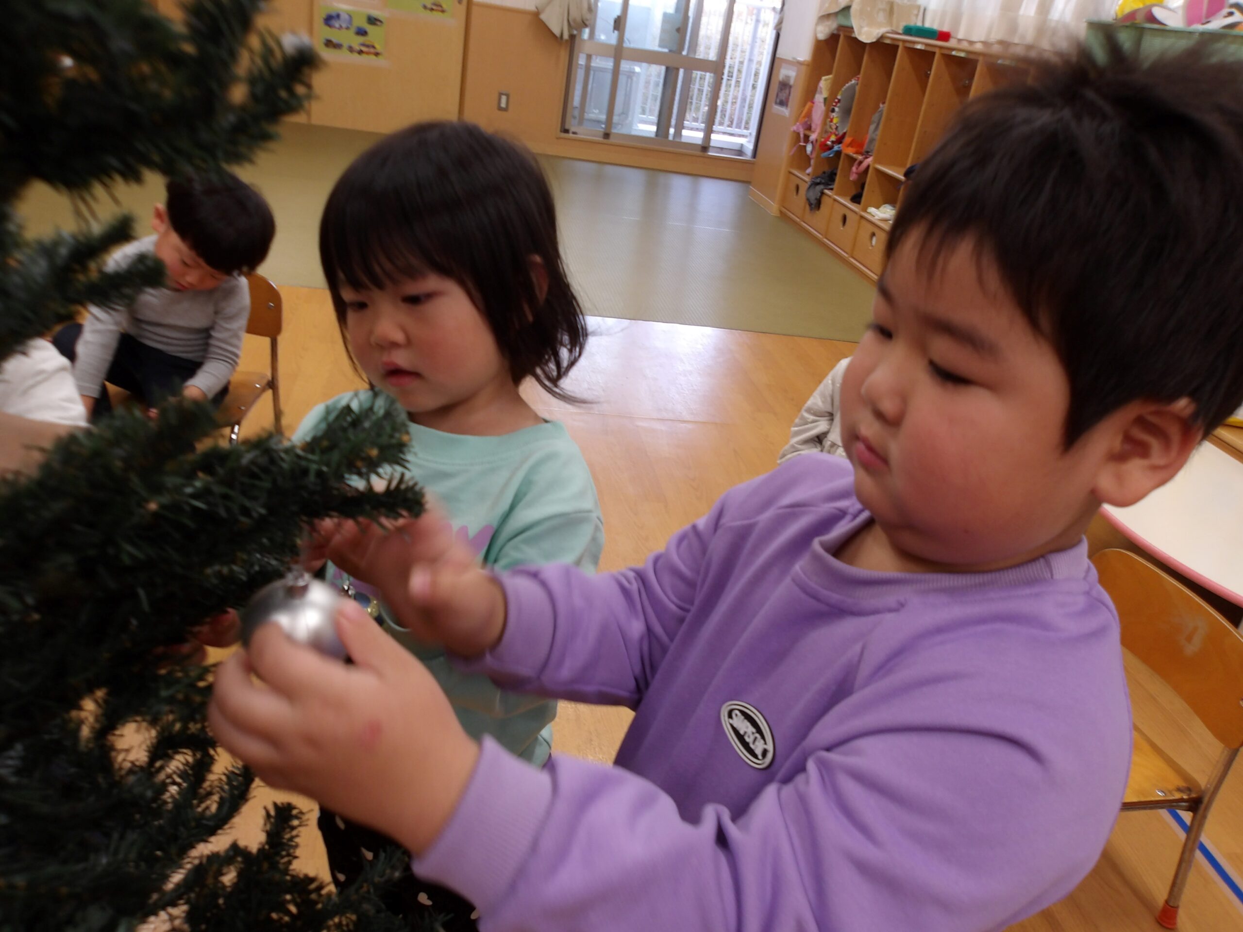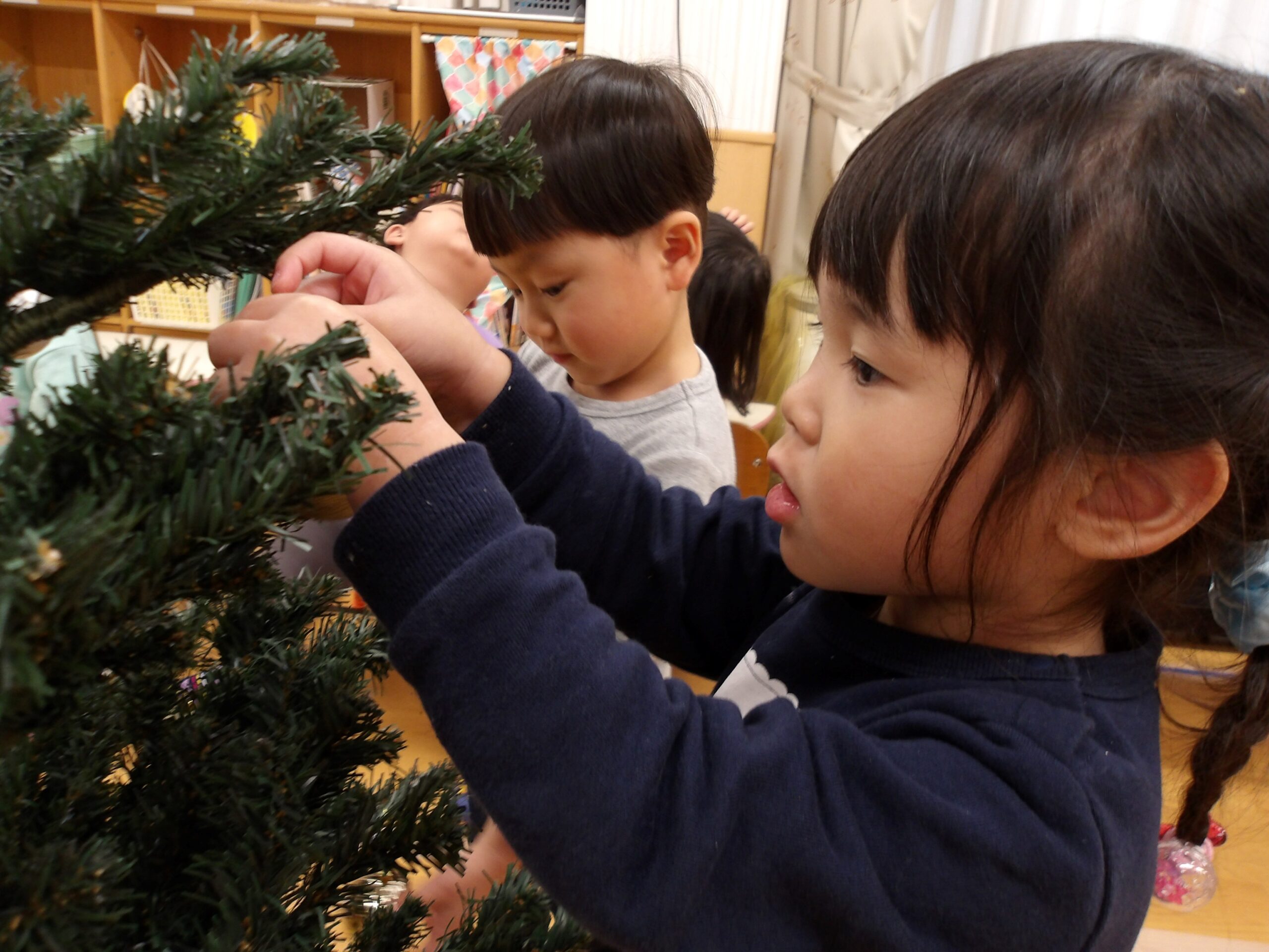 部屋でクリスマスツリーの飾りつけをしました。飾りを見た子ども達は目をキラキラさせて「かわいいい!!キラキラしてる!」「飾っていいの?!」と大興奮でした。「サンタさん喜んでくれるかな?」と、友達や保育教諭と話をしながらのクリスマスツリーの飾りつけが始まりました。室内遊びの時にも「サンタさん来るかな?」「プレゼントなにかな?」とクリスマスを楽しみにしています。