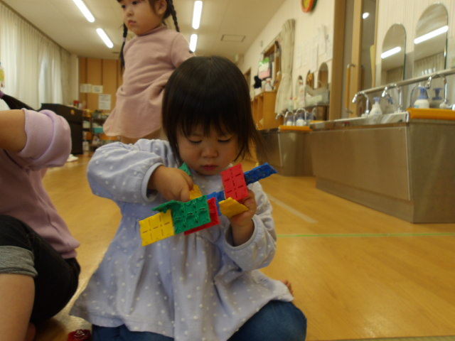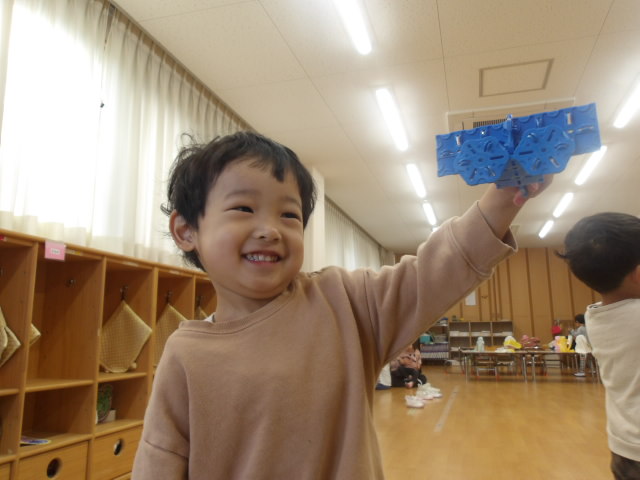 最初は、はめ込むことが難しく先生に作ってもらっていた玩具は今では自分たちで作ることができるようになりました。「先生、飛行機作ったよ」「これはダダンダン!」と子どもたちは想像力を働かせて作って遊ぶことができています。見た目だけでは分からず「これはなぁに?」と質問すると「おしゃぶりだよ」とごっご遊びに必要な道具まで作ることができています。子ども達の想像力にはいつも驚かされています。