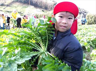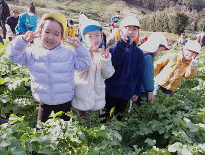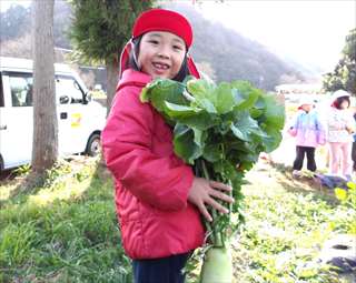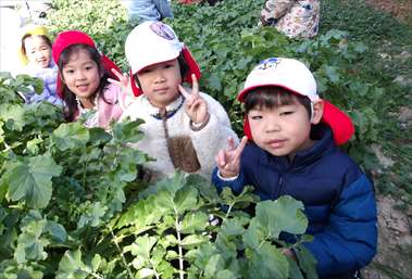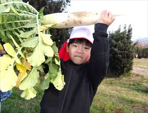 ばら・ゆり組が、バスに乗ってアルムの里へ大根掘りに行きました。ひとつひとつがとっても大きな大根だったので、力いっぱい全身を使って頑張って掘りました。大根が収穫できると、目を丸くしながら大喜び。帰り道では、大きすぎて持つのもやっとでしたが、さっそく「おでんにしようかな!」と友達同士で料理の話しが盛りあがっていましたよ。