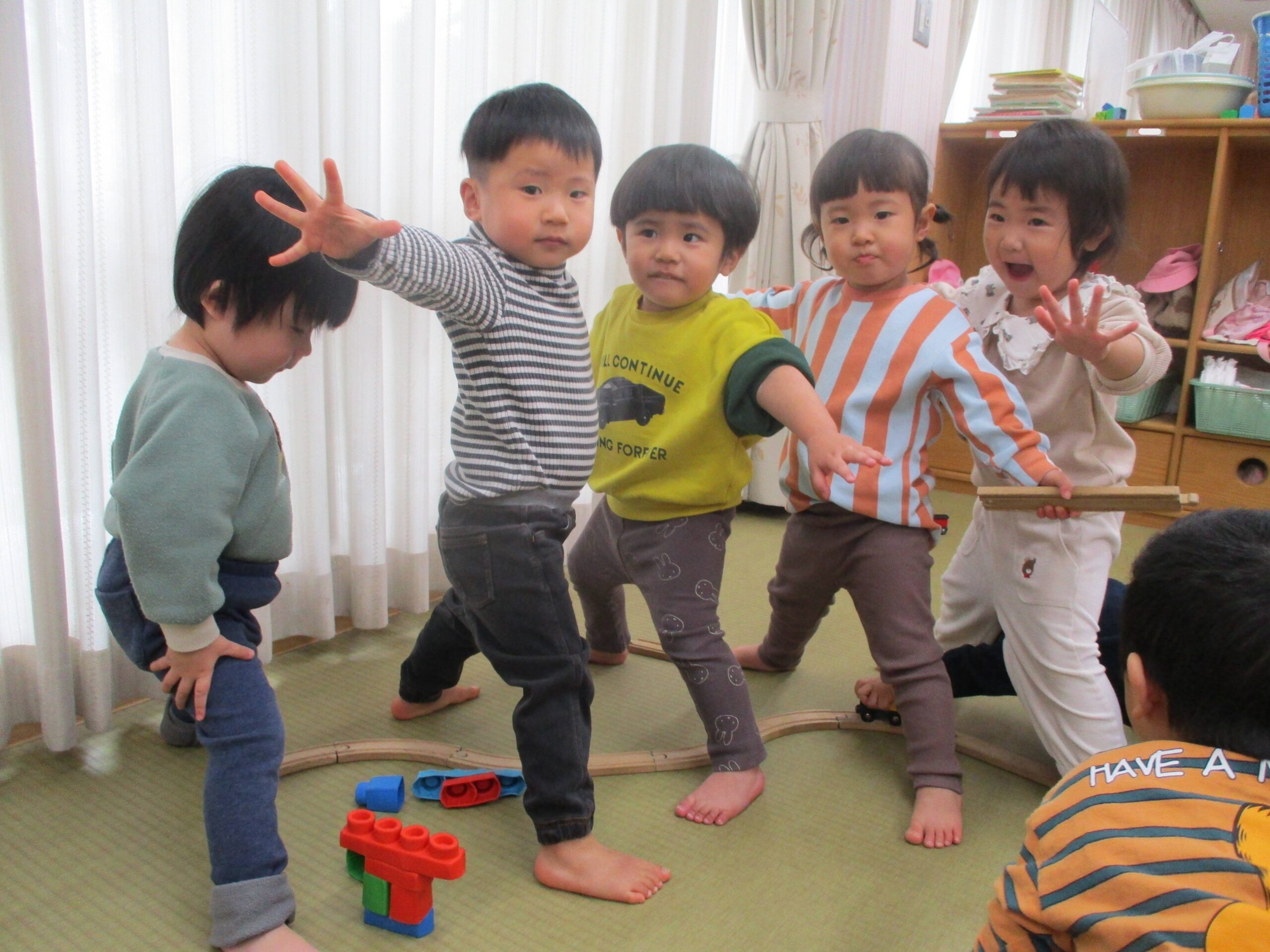 電車遊びが大好きなひばり組で最近盛り上がっているのはトンネルごっこです。足を開いて立つと「ここにトンネルがあります!」と、みんなに呼び掛けて通ってもらいます。小さな体で大きく足を開いて友達が通れるように気にかけている姿がとてもかわいらしいです。すぐに大人気スポットになり友達が集まって「僕もする。」「こっちも通っていいよ~!」と、賑やかな声が聞かれました。