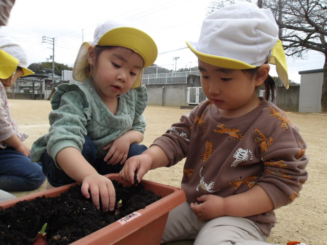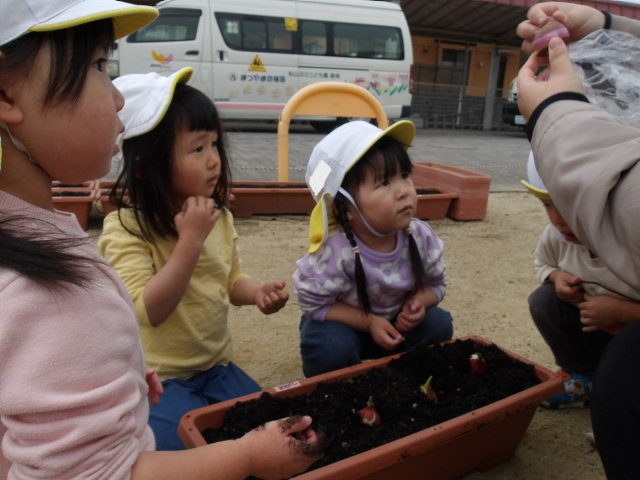 子ども達に球根を見せ、「これ、なーんだ!」と声を掛けると「たまねぎ!」との答えが…「違うよ。これ、食べられないよ。」「えーでも、白いのが見えてるよ。(茶色皮が剥けて)」と子ども達の中で球根についての討論がされていました。「これはね、“球根”っていうんだよ。チューリップが咲くの。」と伝えると“へぇ~”の表情でした^^今まで、夏野菜や冬野菜を植えたことのある子ども達は、「やりたい!やりたい!」と土の穴掘りや球根植え、水やりを意欲的に取り組んでくれました。
