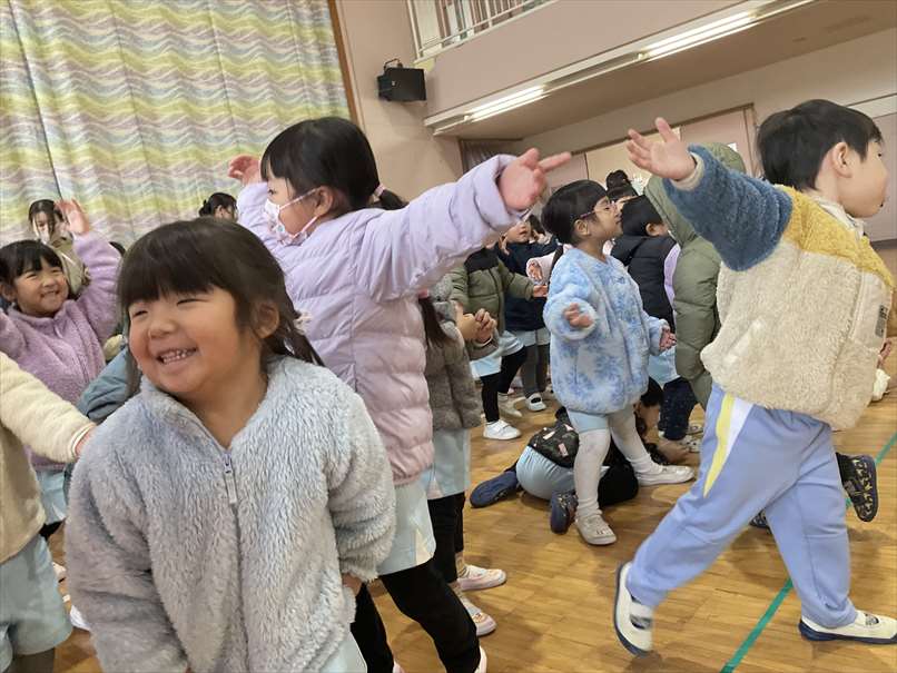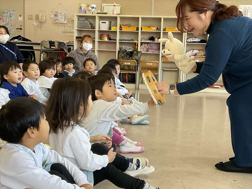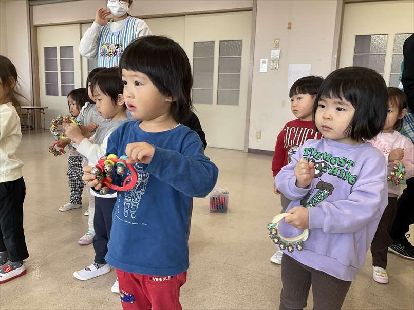 タンバリン、すず、トライアングルの使い方を教えてもらい、実際に自分たちで使ってみました。「シャンシャン」「リンリン」鳴る音に大喜びでした。『おおきなたいこ ちいさなたいこ』や『しあわせなら手を叩こう』のリズムにのせて楽器を鳴らしました。『雪だるまを作ろう』や『ゆき』を歌ったり『お~ちた おちた な~にがおちた』をしたりして楽しみました。