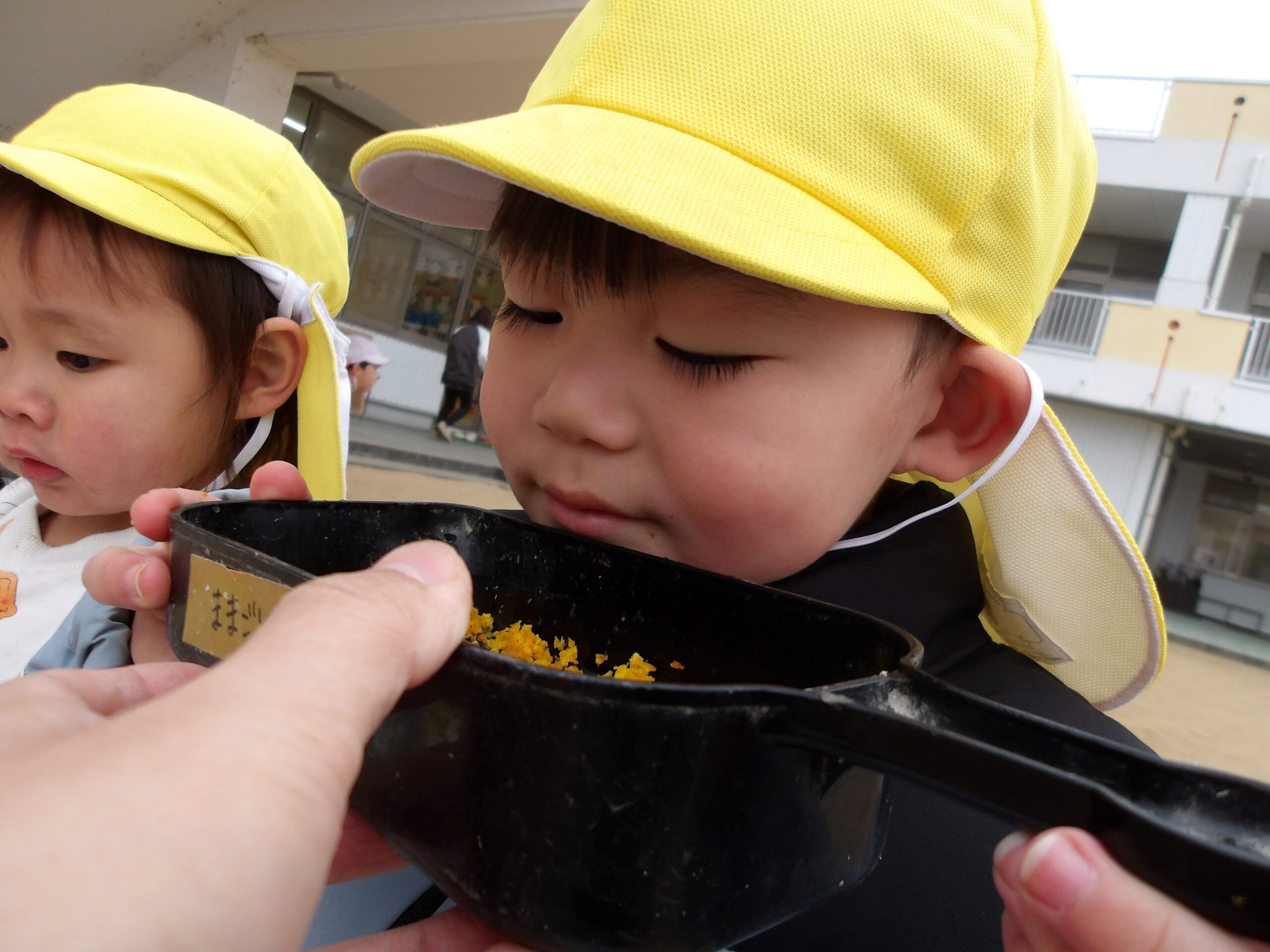 園庭遊びでは、ままごとを楽しんでいる姿が見られています。「何を作ったの?」と子ども達に聞いてみると「サラダ!!」「スープ!!」「カレー!!」と笑顔で教えてくれました。中には、「先生食べていいよ!!」と笑顔いっぱいで作った料理を渡してくれます。ミカンが置いてあることに気付き、切った後匂いを嗅いで「いい匂いがする!」と友達にも共有していてかわいかったです。