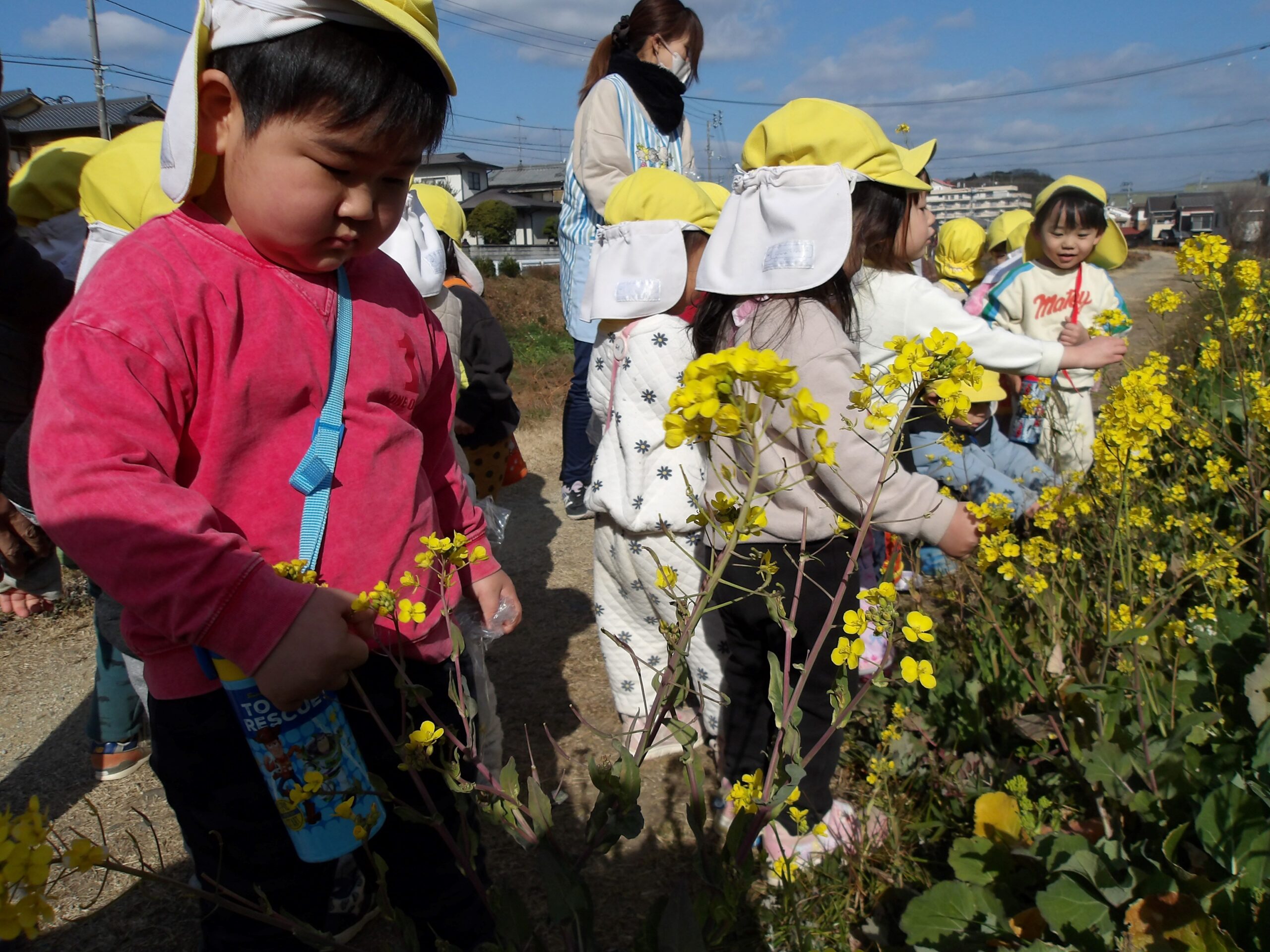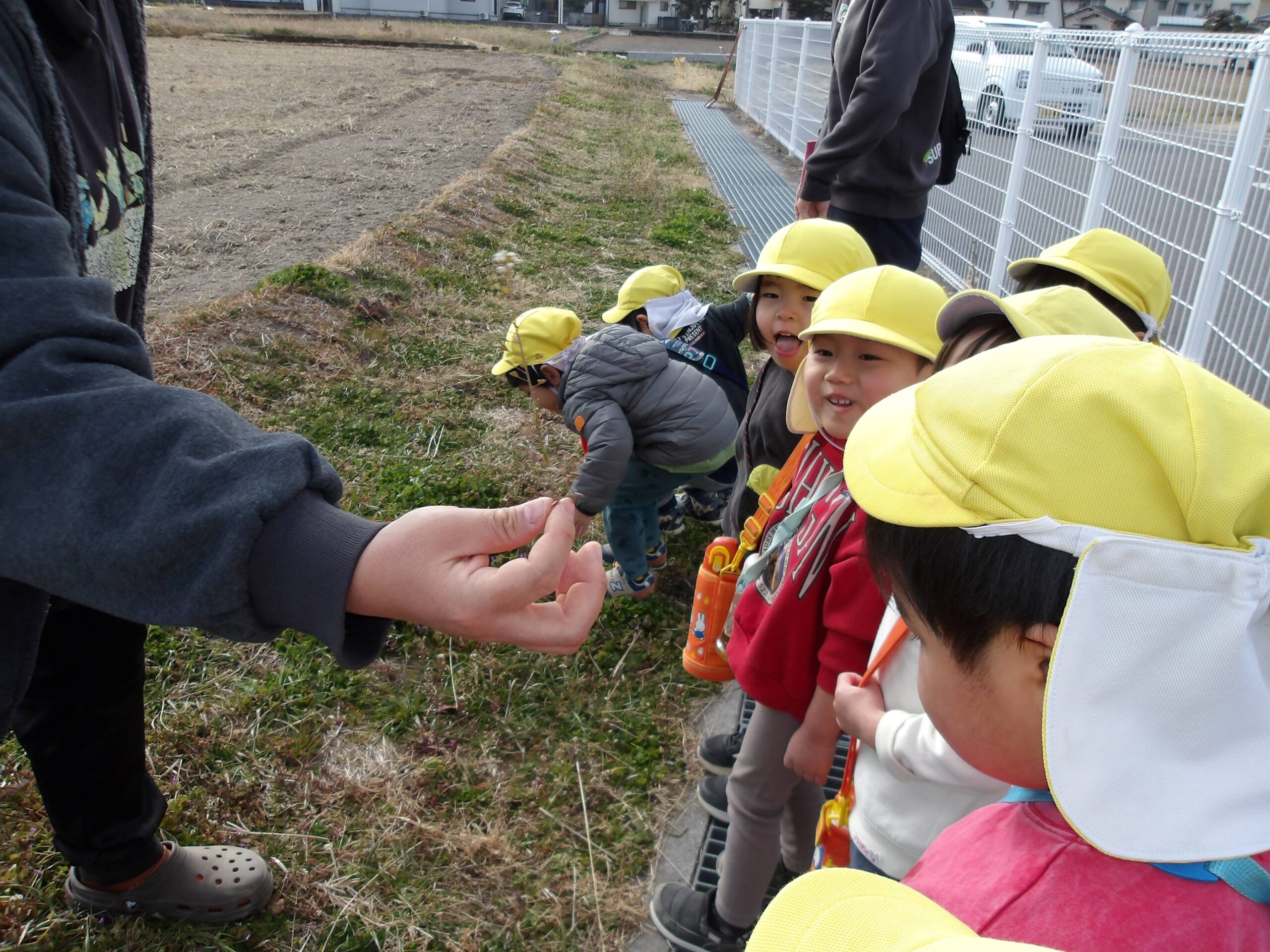 散歩に行ってきました。散歩では、はるか先生がナズナを見つけ、「葉っぱの所を茎から取れないように剥くとカラカラって音が鳴るよ。」と教えて実際に聞かせてくれました。みんな、音を聞こうと静かに聞いていました。音が聞こえると「カラカラ言ってる!」「聞こえた!!」と嬉しそうに笑っていました。その後も春を探しに大探検。菜の花を見つけると「ママにあげる!!」と言って袋に入れて大切に持ち帰りました。