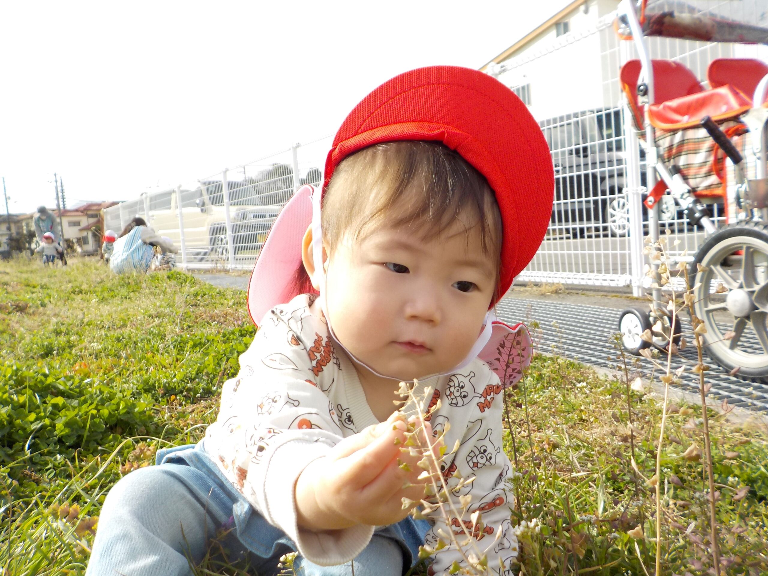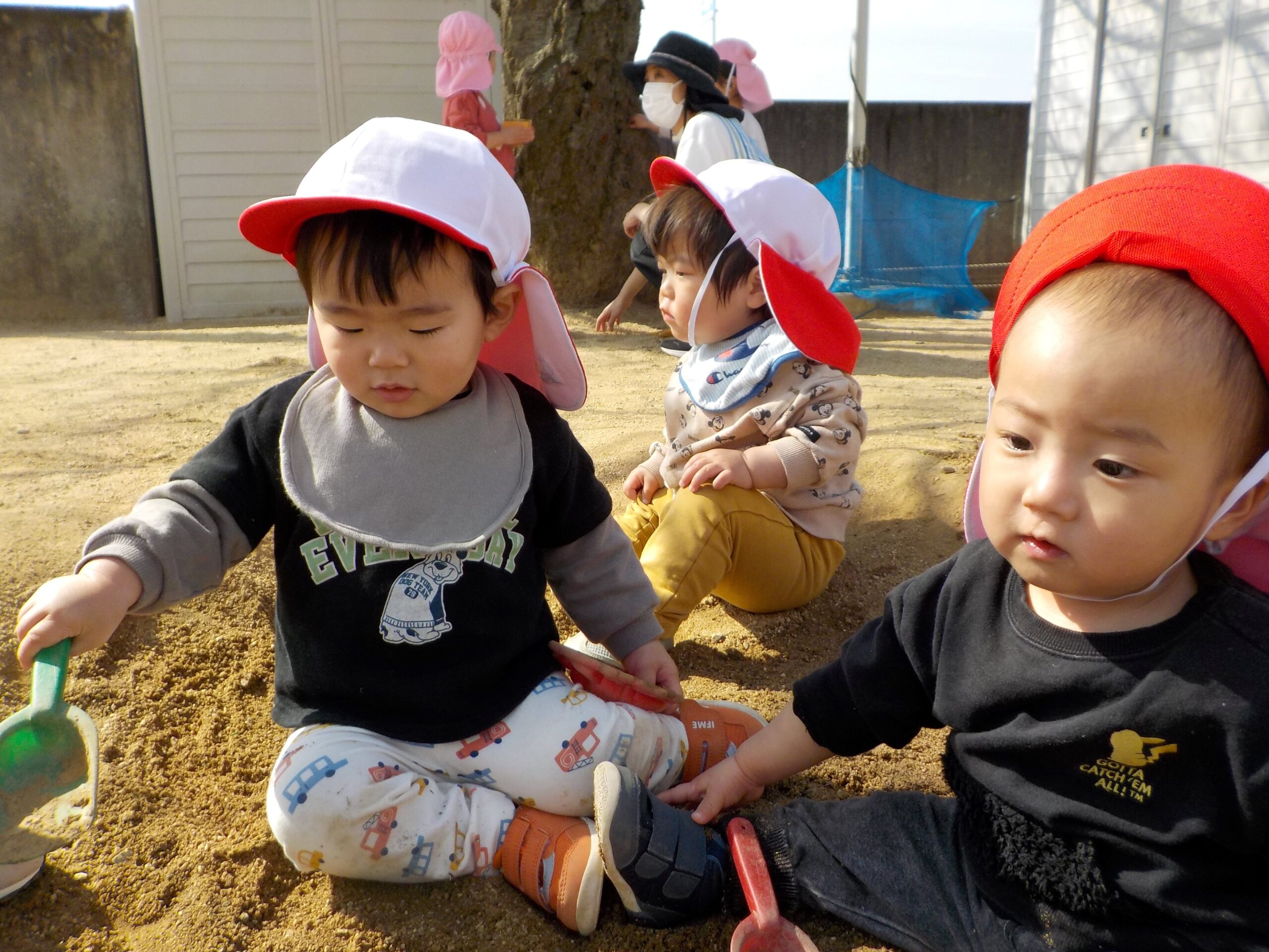 寒い冬が終わり、春の暖かな日差しを感じることができるようになってきました。戸外に出てたくさん体を動かして遊んでいます。畑で花を見つけるとツンツンと触ったりじっと見たりしていました。たくさん探索をして春を感じています。また、桜の木の下にできたくぼみに入ってスコップで砂をすくったり手で砂を触って感触を楽しんだりしました。