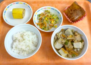 News & Topics Top News & Topics 9月18日(木)の給食 ★ 今日のメニュー ★ 麦ごはん、芋炊き、春雨サラダ、バナナ 手作りおやつはきなこトーストです。 今日も美味しく仕上がりました♪ 2025.09.18 本日の給食