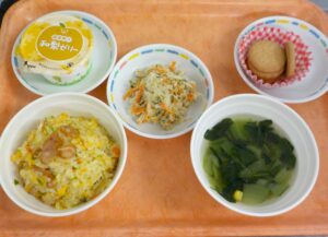 News & Topics Top News & Topics 9月19日(金)の給食 ★ 今日のメニュー ★ チャーハン、バンバンジー、 チンゲン菜のスープ、梨ゼリー おやつはビスケットです。 今日も美味しく仕上がりました♪ 2025.09.19 本日の給食