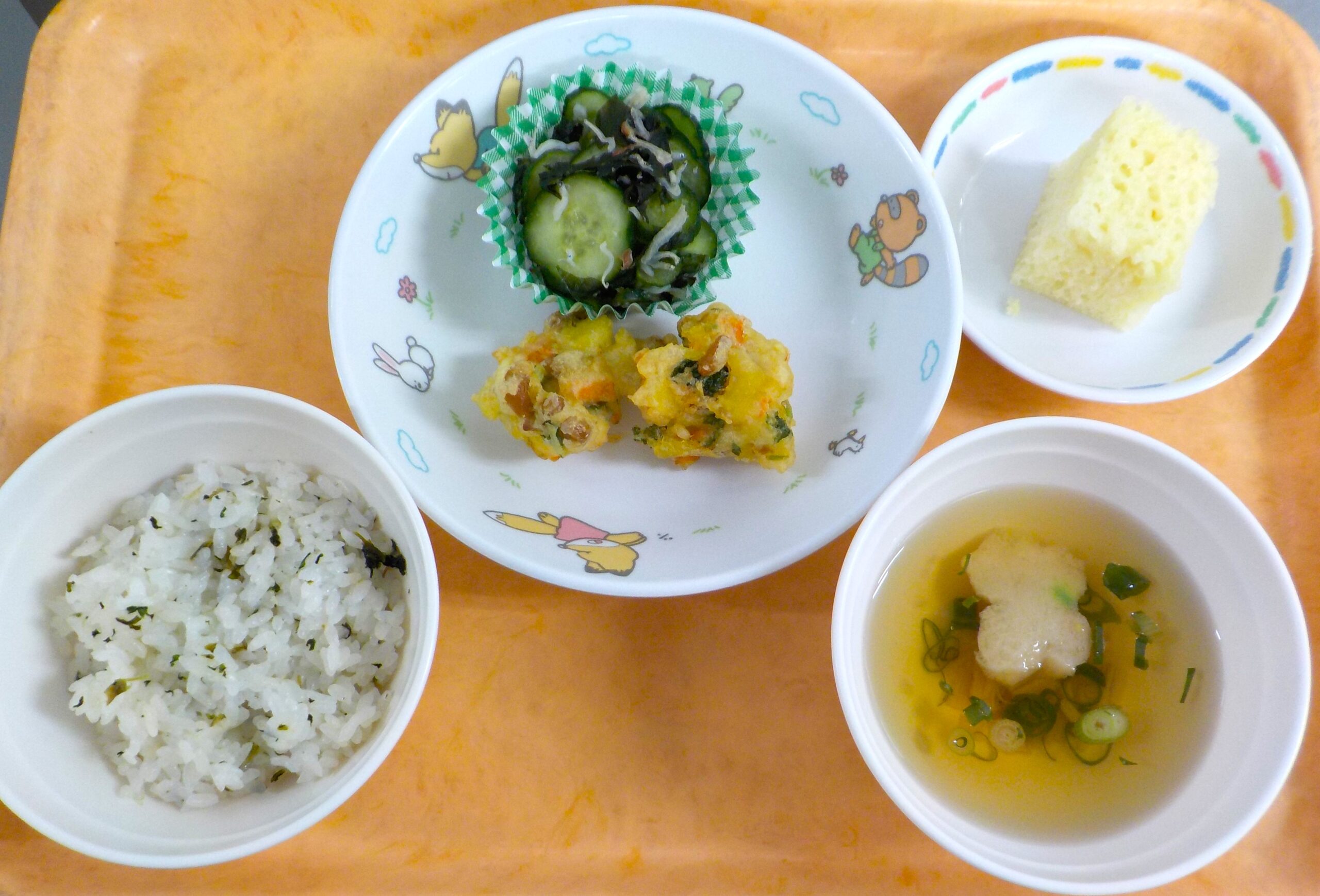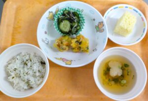 News & Topics Top News & Topics 10月1日(水)の給食 ★ 今日のメニュー ★ 菜めし、大豆のかき揚げ天、 きゅうりとしらすの酢の物、すまし汁 おやつはヨーグルト蒸しパンです。 今日も美味しく仕上がりました♪ 2025.10.01 本日の給食
