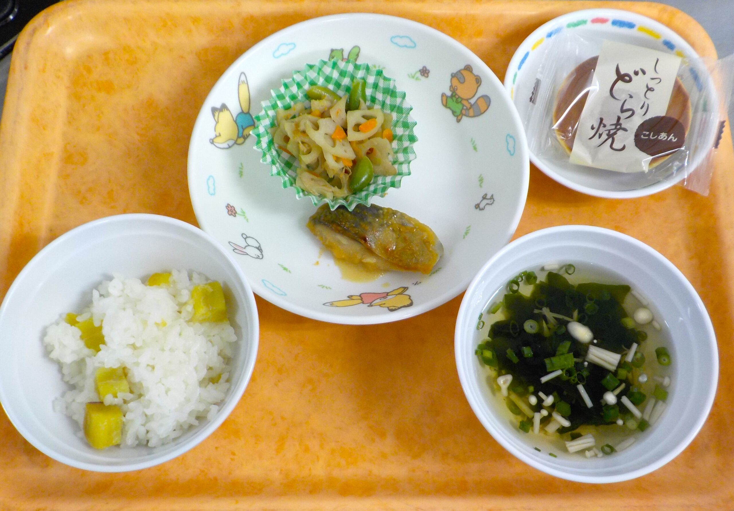 News & Topics Top News & Topics 10月9日(木)の給食 ★ 今日のメニュー ★ さつまいもご飯、さわらの西京漬け、 きんぴられんこん、すまし汁 おやつはどら焼きです。 今日も美味しく仕上がりました♪ 2025.10.09 本日の給食