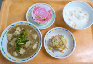 News & Topics Top News & Topics 10月29日(水)の給食 ★ 今日のメニュー ★ 麻婆豆腐丼、野菜サラダ、ももゼリー 手作りおやつはフルーツのヨーグルト和えです。 今日も美味しく仕上がりました♪ 2025.10.29 本日の給食